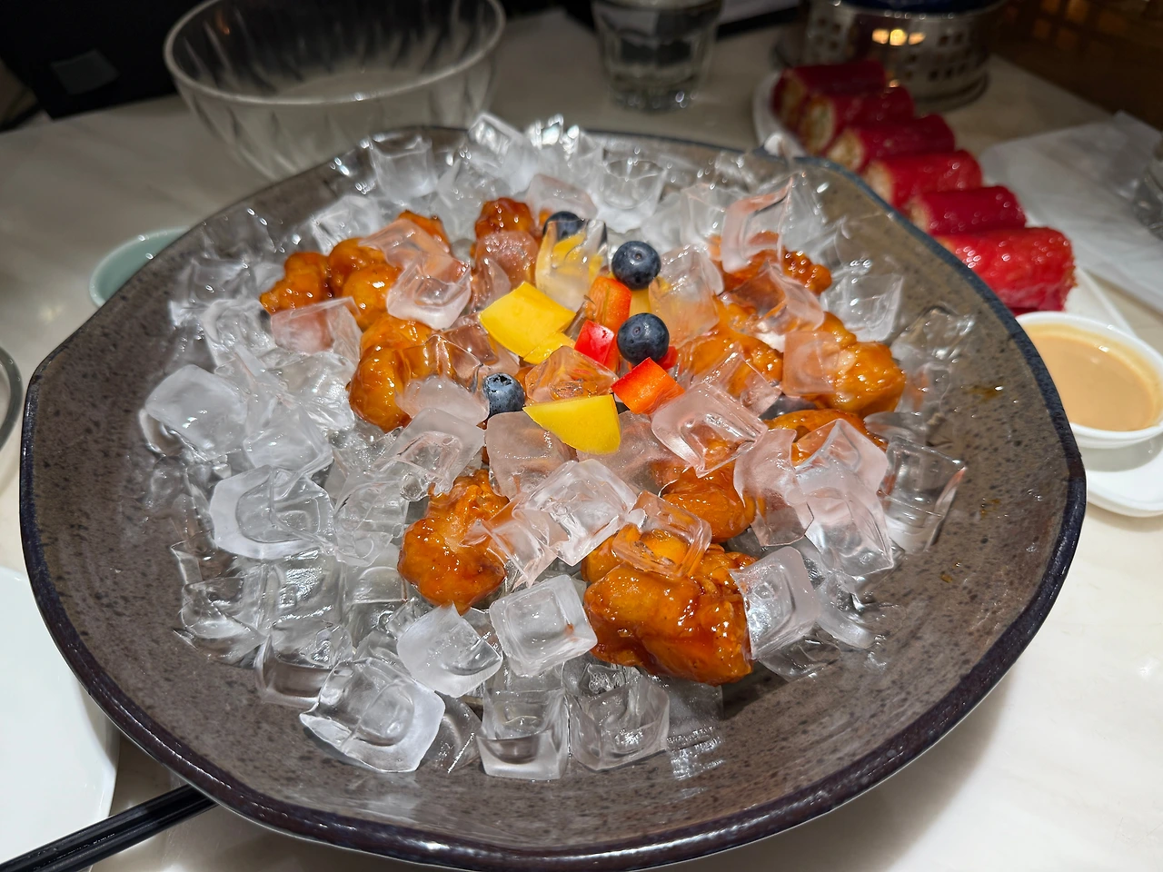 광저우 타오타오쥐의 명물 얼음탕수육이에요. 왜 익힌 음식을 다시 얼음에 먹지? 의아했는데 먹고 나서 감탄. 탕수육 튀김 안 내용물이 차가운 온도 덕에 탱글탱글 식감이 너무 좋았어요. 뜨겁지 않으니 어린 아이도 어렵지 않게 맛있게 얌냠.