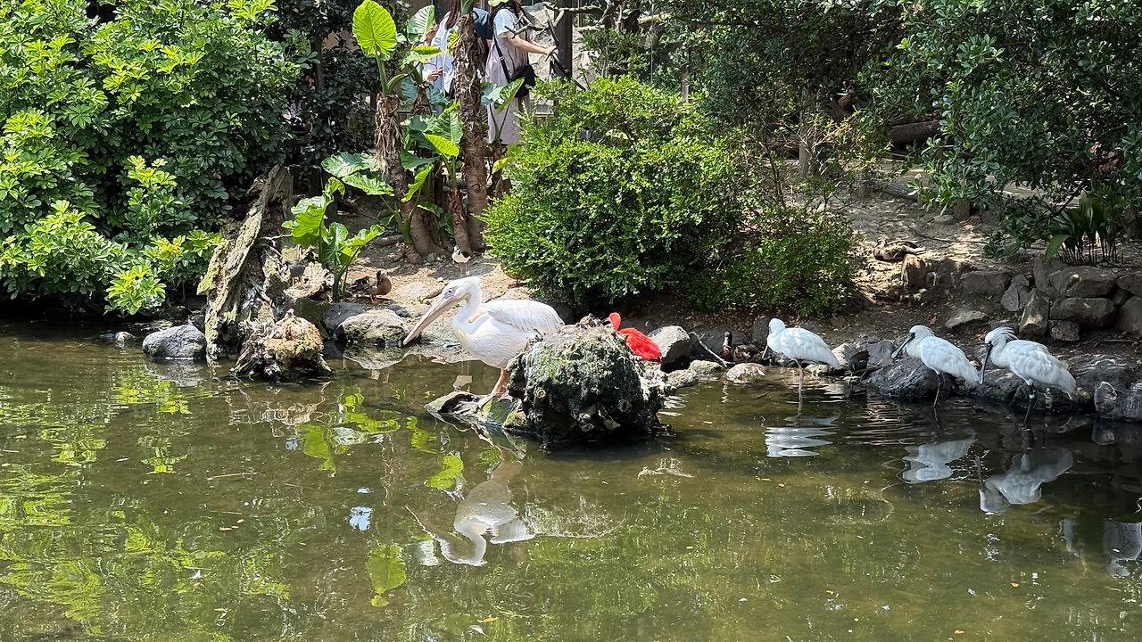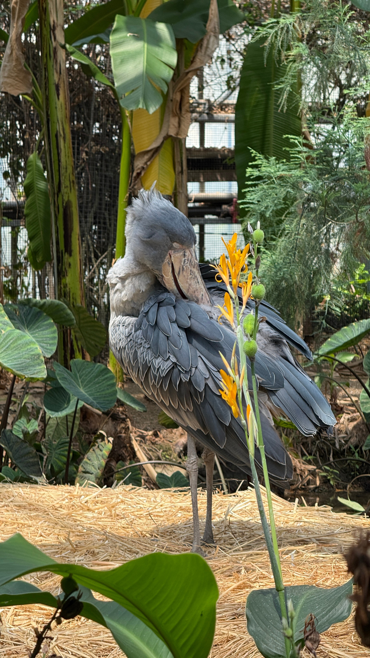 고베동물왕국에서 만난 이 혹부리황새는 정말 인상적이었어요. 마치 조각상처럼 가만히 서 있다가, 어느 순간 부리를 깃털에 묻고 천천히 털을 다듬는 모습이 아주 고요하고 신비로웠습니다. 영어 이름이 ‘Shoebill’인데, 그 이유는 부리 모양이 신발처럼 넓고 두툼해서 그렇다고 해요. 중앙 아프리카의 습지에 사는 희귀 조류로, 일본에서도 이렇게 가까이에서 볼 수 있는 곳은 드물다고 합니다. 크기는 키가 1미터가 넘고 날개를 펴면 거의 2미터에 달한다고 하네요. 생김새는 무뚝뚝하고 위엄 있지만, 조용하고 움직임이 느린 성격 때문에 오히려 친근하게 느껴졌어요.