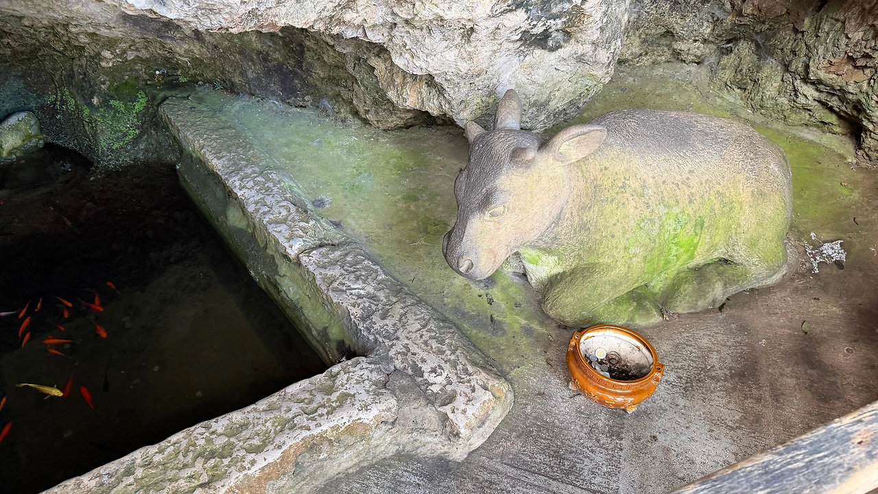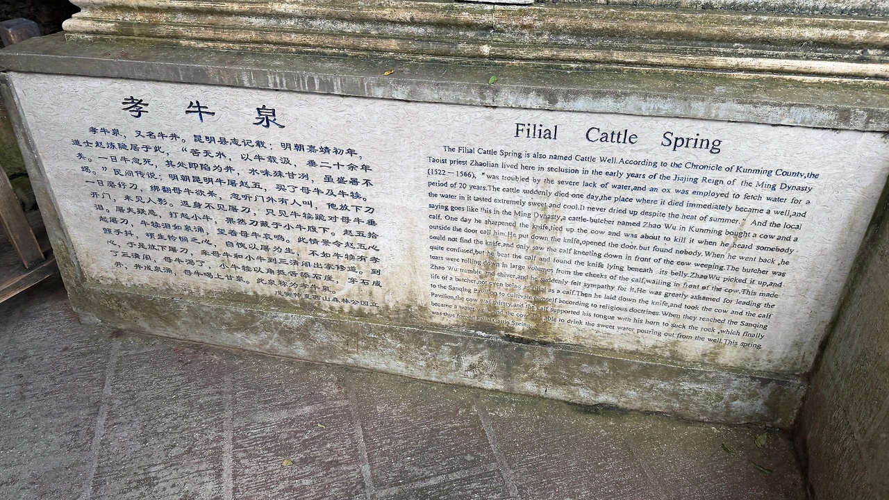 옛날에 이 지역은 가뭄이 심해 농사에 큰 어려움을 겪었는데, 하늘에서 한 신이 소 한 마리를 내려보내 뎬츠호의 물을 끌어올리게 했다고 합니다. 그 소가 서산까지 와서 물길을 뚫고는, 임무를 마치자 그대로 바위로 변해 지금의 ‘석우’가 되었다는 설화입니다. 그래서 사람들은 이 소가 풍요와 비를 부르는 상징, 그리고 뎬츠호의 수호신이라고 믿었습니다. 소의 머리를 만지면 행운이 온다고 해서 저도 아이를 안아서 만지게 도와주었습니다 ㅋㅋㅋ