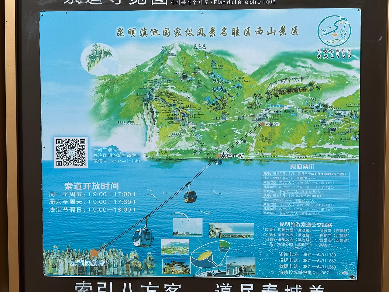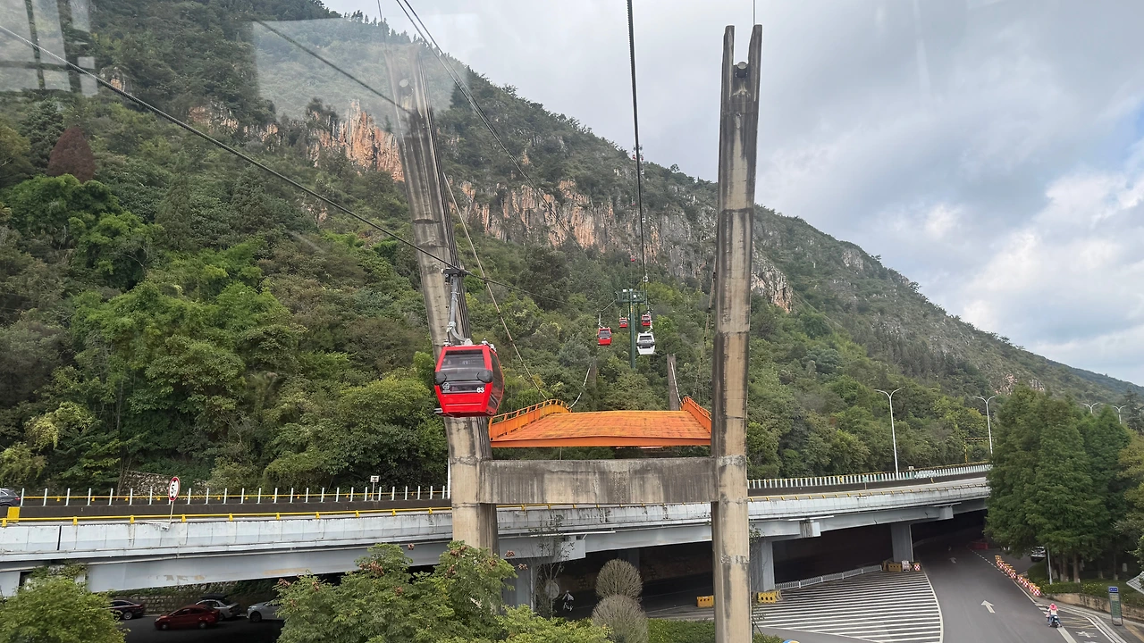 곤명 관광 케이블카(구 덴츠호 서산 케이블카)는 프랑스와 이탈리아에서 생산된 세계 최고 수준의 케이블카 장비를 사용하며, 전체 길이의 절반이 덴츠호수를 가로지르며 물과 산을 모두 횡단하는 보기 드문 케이블카입니다. 로프웨이를 타는 것은 쿤밍을 방문하는 대부분의 관광객에게 인기 있는 활동 중 하나입니다. 산기슭에는 뎬츠호(Dianchi Lake)가 있고, 올려다보면 장엄한 서산(Xishan Mountain)이 보입니다. 케이블카를 타고 관광객들은 뎬츠호(Dianchi Lake)와 서산 풍경명승구(Xishan Scenic Area)를 쉽게 방문할 수 있습니다.