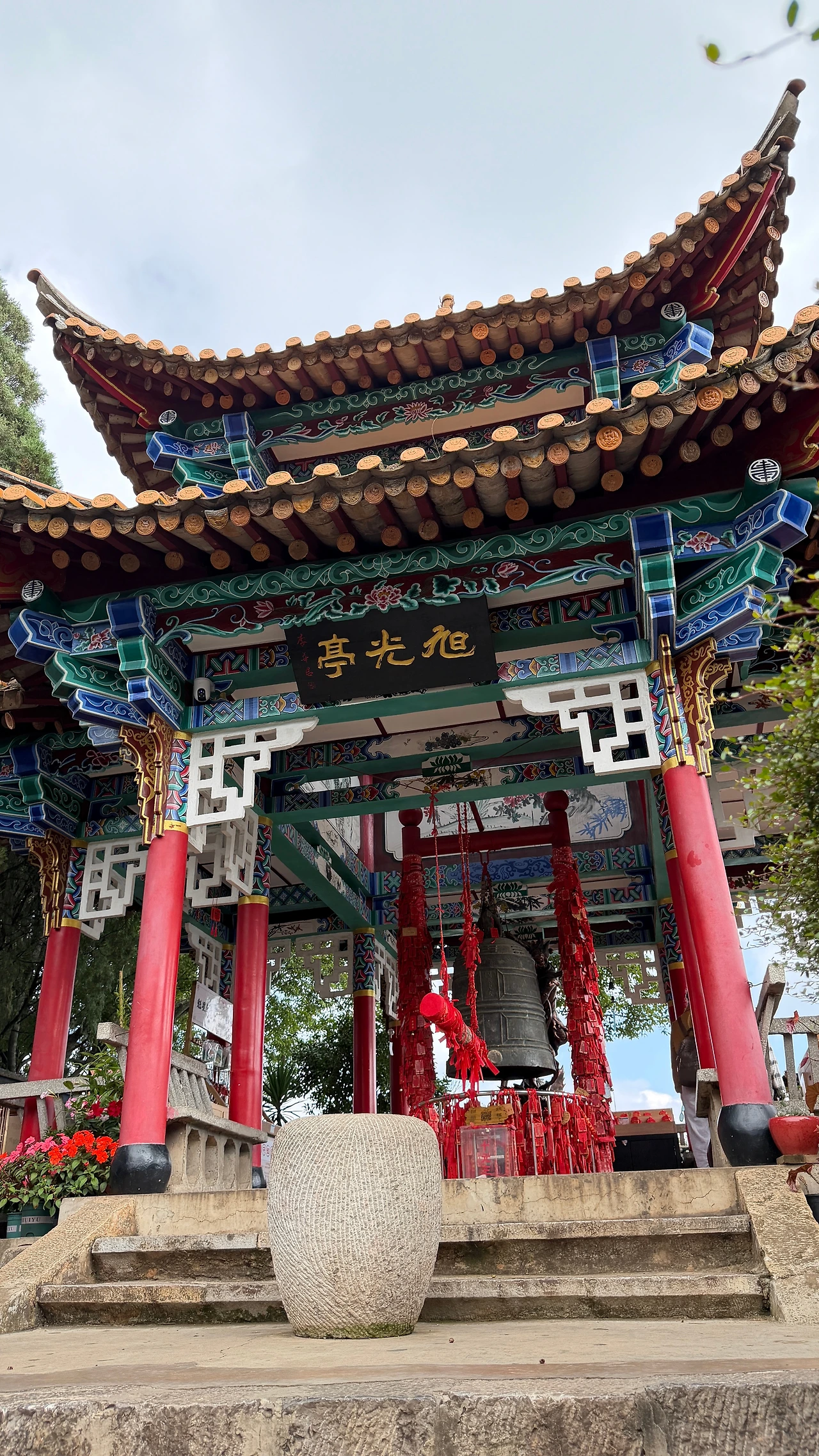 출구 나가면 풍경 내려다 보이는 좋은 길목에 정자가 있어요. 현판에 쓰인 ‘쉬광팅 旭光亭’의 의미는 ‘아침 해가 비추는 정자’ 혹은 ‘해돋이의 빛을 맞이하는 누각’이라는 뜻이에요. 청동 종이 걸려 있는데, 관광객들이 행운을 기원하며 종을 울리고 붉은 리본(소원끈)을 매달 수 있었어요.