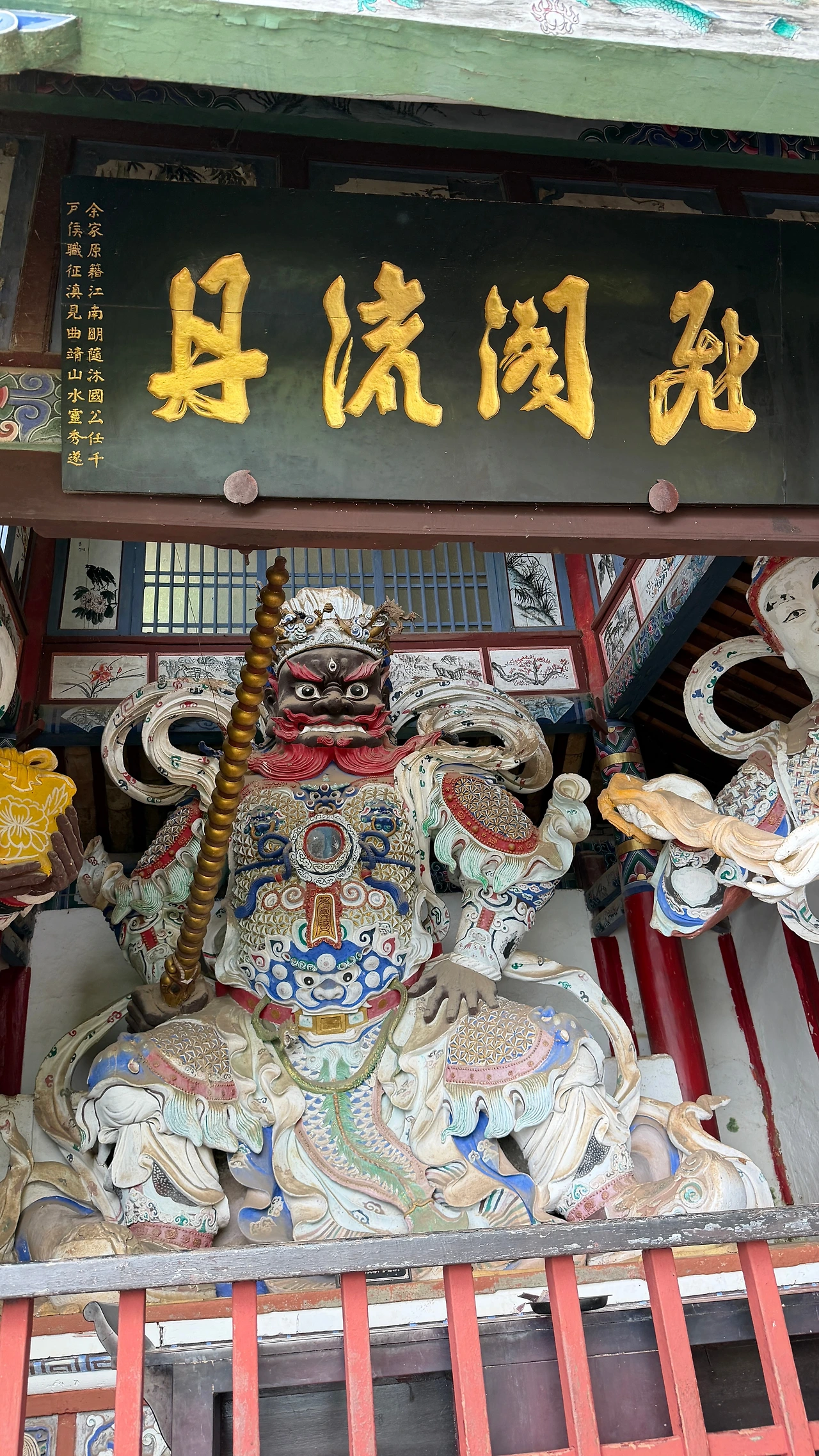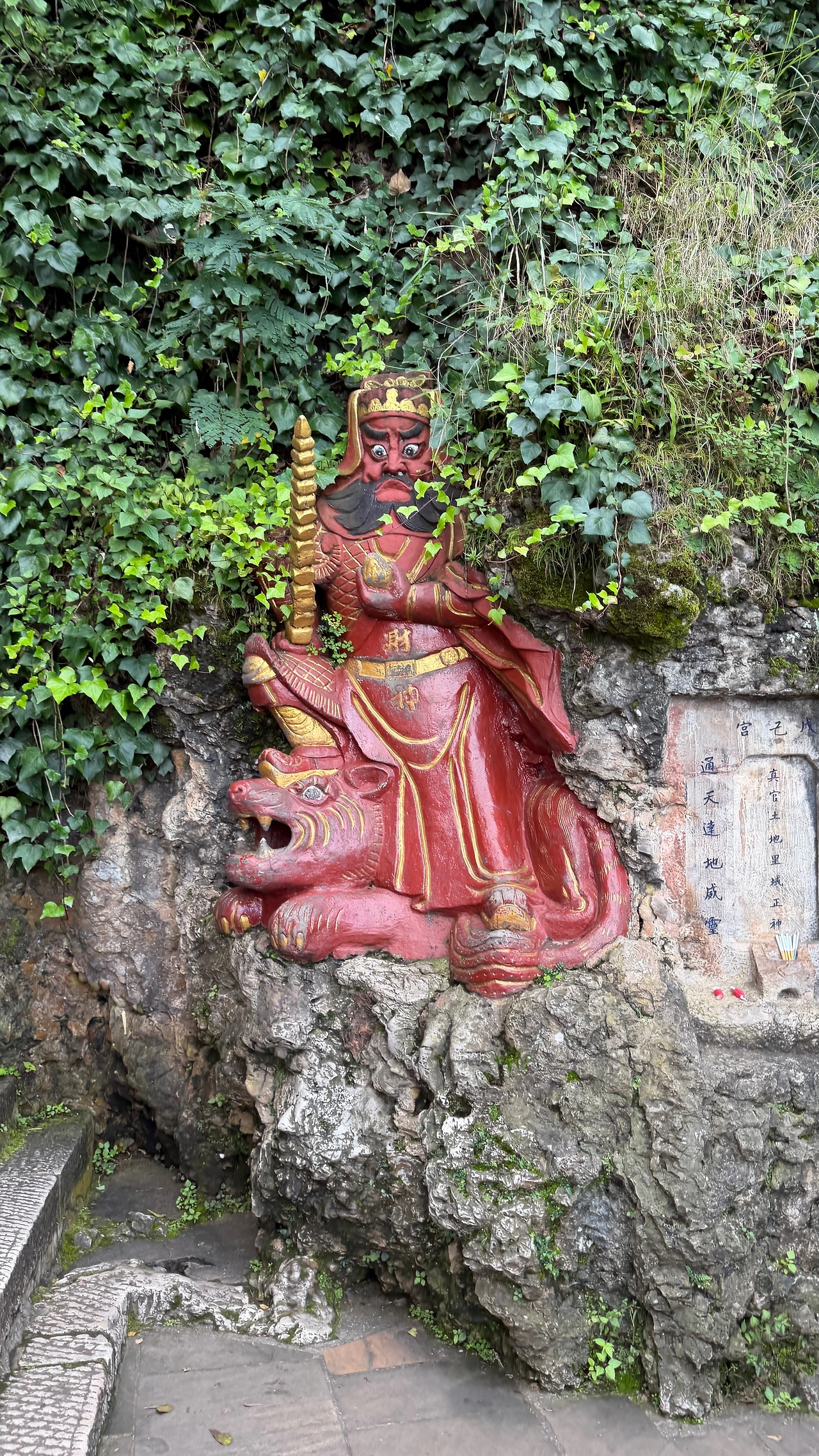 관우인줄 알았는데 도교 수호신 조형물이라고 하네요. 보통 ‘산문신(山门神)’ 혹은 ‘천군신(天将神)’으로 불리며, 악귀의 침입을 막고 성역을 보호하는 역할을 한다고 합니다. 붉은 갑옷과 칼, 그리고 맹수를 밟고 선 자세는 힘과 정의를 상징하고, 도교에서는 천상의 장군이 마귀를 제압하는 형상으로 자주 등장합니다. 특히 서산 풍경구처럼 절벽을 따라 사당과 동굴이 이어지는 곳에서는 이런 신상이 방문객의 안전과 복을 지켜준다는 의미로 세워져요.