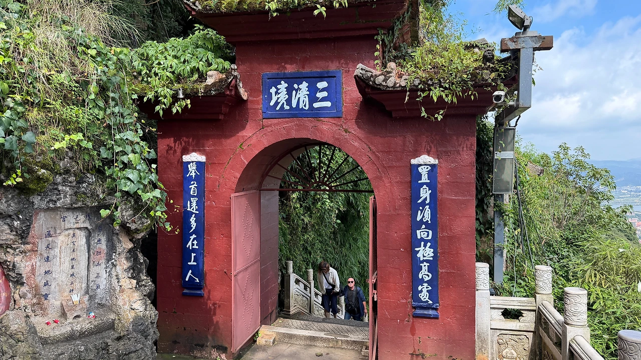 이 문은 서산 풍경구의 삼청각(三清阁) 입구로, 도교 사원의 상징적인 공간입니다. ‘삼청’은 옥청(玉清), 상청(上清), 태청(太清) — 세 하늘의 신을 모시는 곳을 뜻한다고 합니다. 삼청각은 절벽 위 바위에 기대어 지어진 사당으로, 서산의 도교 건축 중 가장 대표적인 곳입니다. 건물은 명대에 처음 세워졌고 이후 여러 차례 보수되며 지금의 형태를 갖췄습니다.