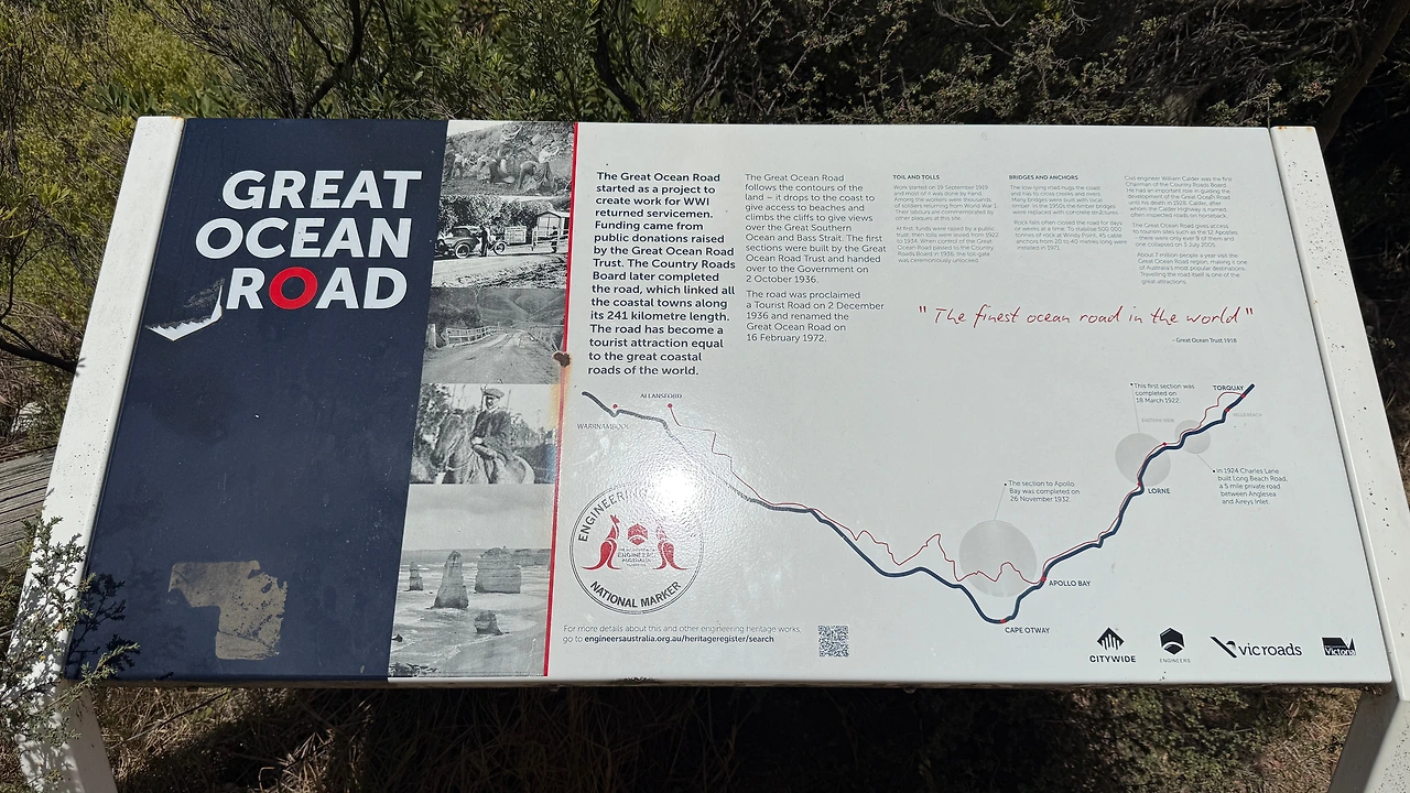 도로 건설 자금은 Great Ocean Road Trust가 모은 공공 기부금으로 충당되었으며, The Country Roads Board가 도로 완공을 맡아 총 241km에 이르는 해안 도시들을 연결하게 되었습니다.