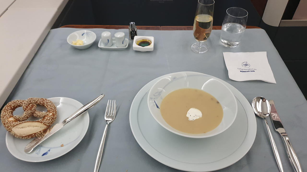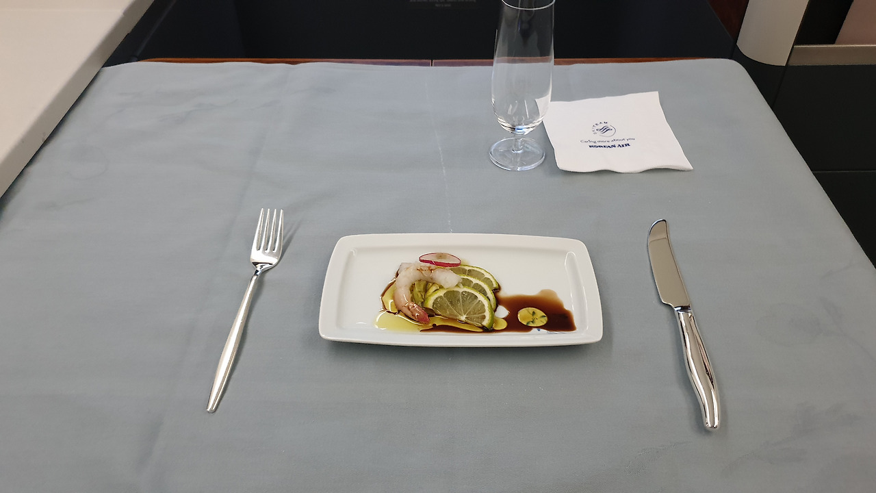 이륙하고 한 시간 정도 지나서 첫번째 식사 셋팅에 들어갑니다. 으리으리한 테이블이 펼쳐집니다. 집에 있는 반상보다 크기가 큰 것 같습니다 ㄷㄷ