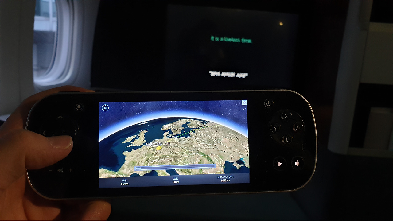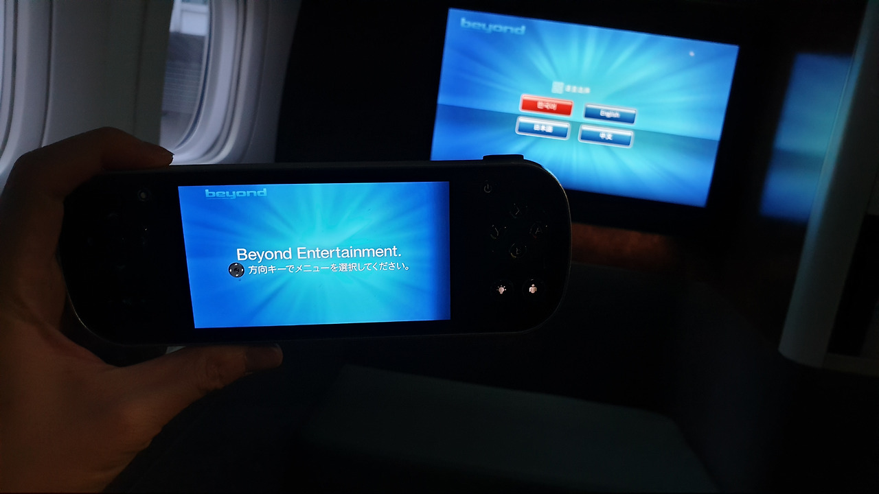 큼지막한 디스플레이를 컨트롤하는 리모콘도 PSP 처럼 다부지게 생겼습니다. 상하좌우 버튼으로도 조작 가능하지만 터치 패널로 직접 선택해서 사용할 수도 있습니다. 메인 디스플레이로 영화를 틀어놔도 리모콘에서는 운항 정보 확인 등 다른 부가 기능을 사용할 수 있었습니다. 이런 신세계를 봤나....