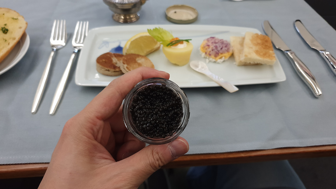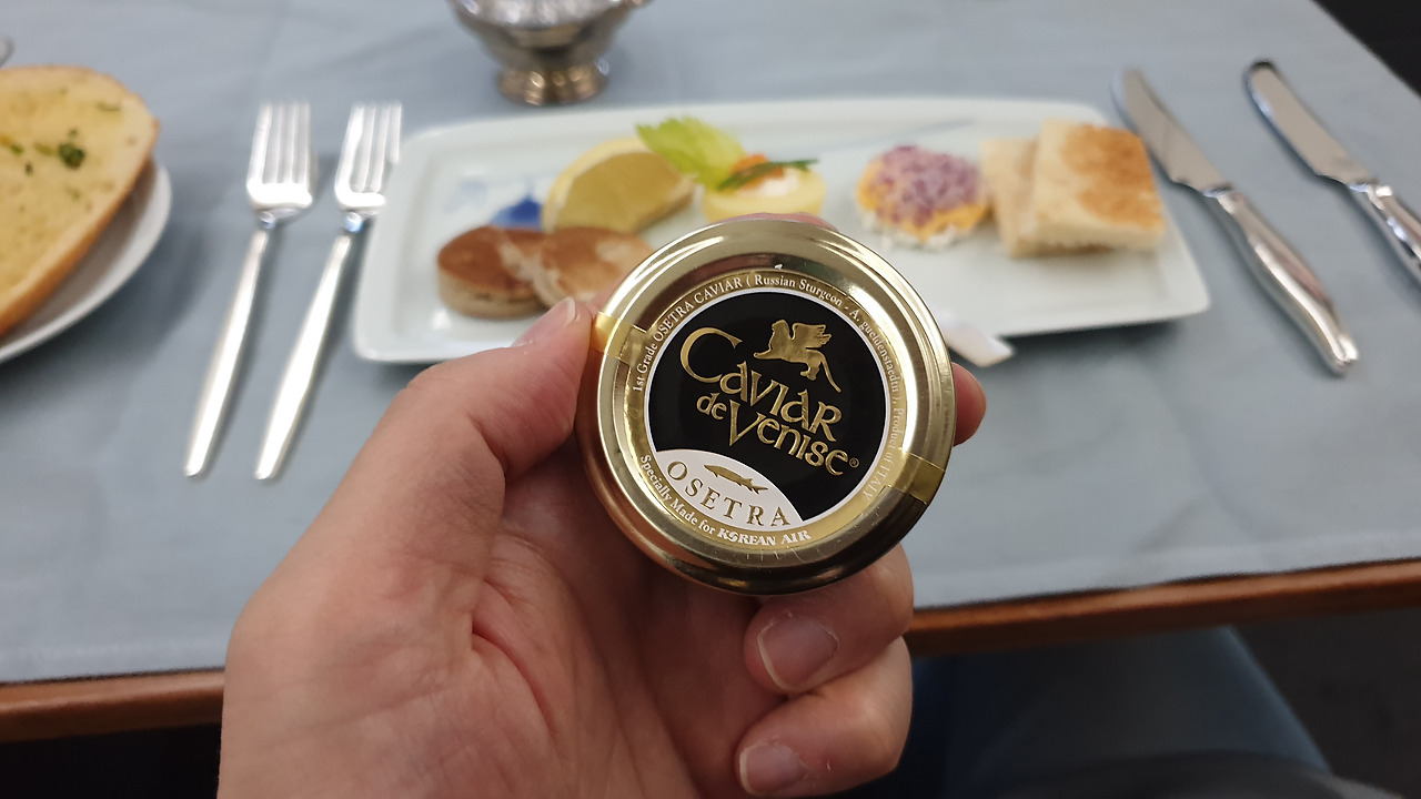 런던 갈 때 A380에서는 푸아그라가 서빙되었었는데 올 때의 B747에서는 캐비어가 제공됩니다. 육지에서도 제대로 먹어본 적이 없는 음식이라 오 이런 맛도 존재하는군 하고 감탄하면서 한 스푼 두 스푼 먹어봅니다.