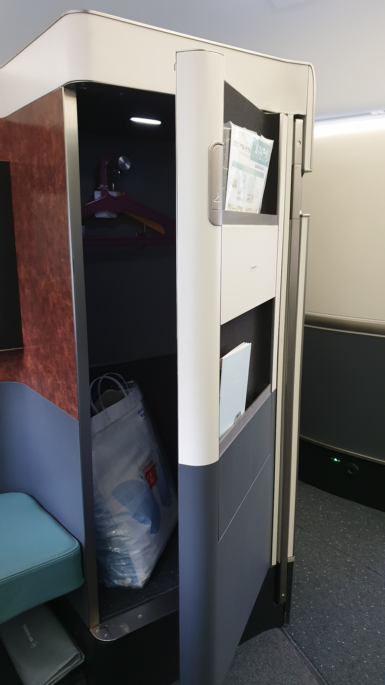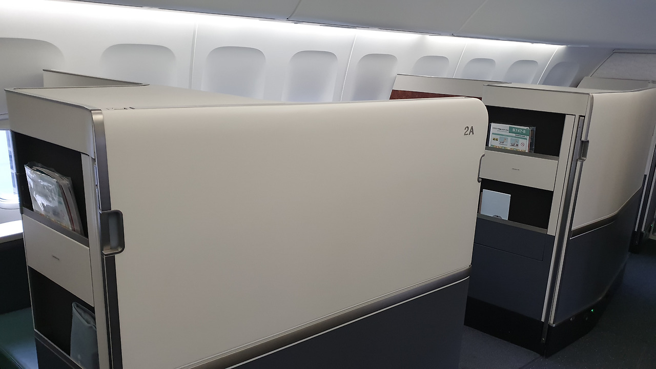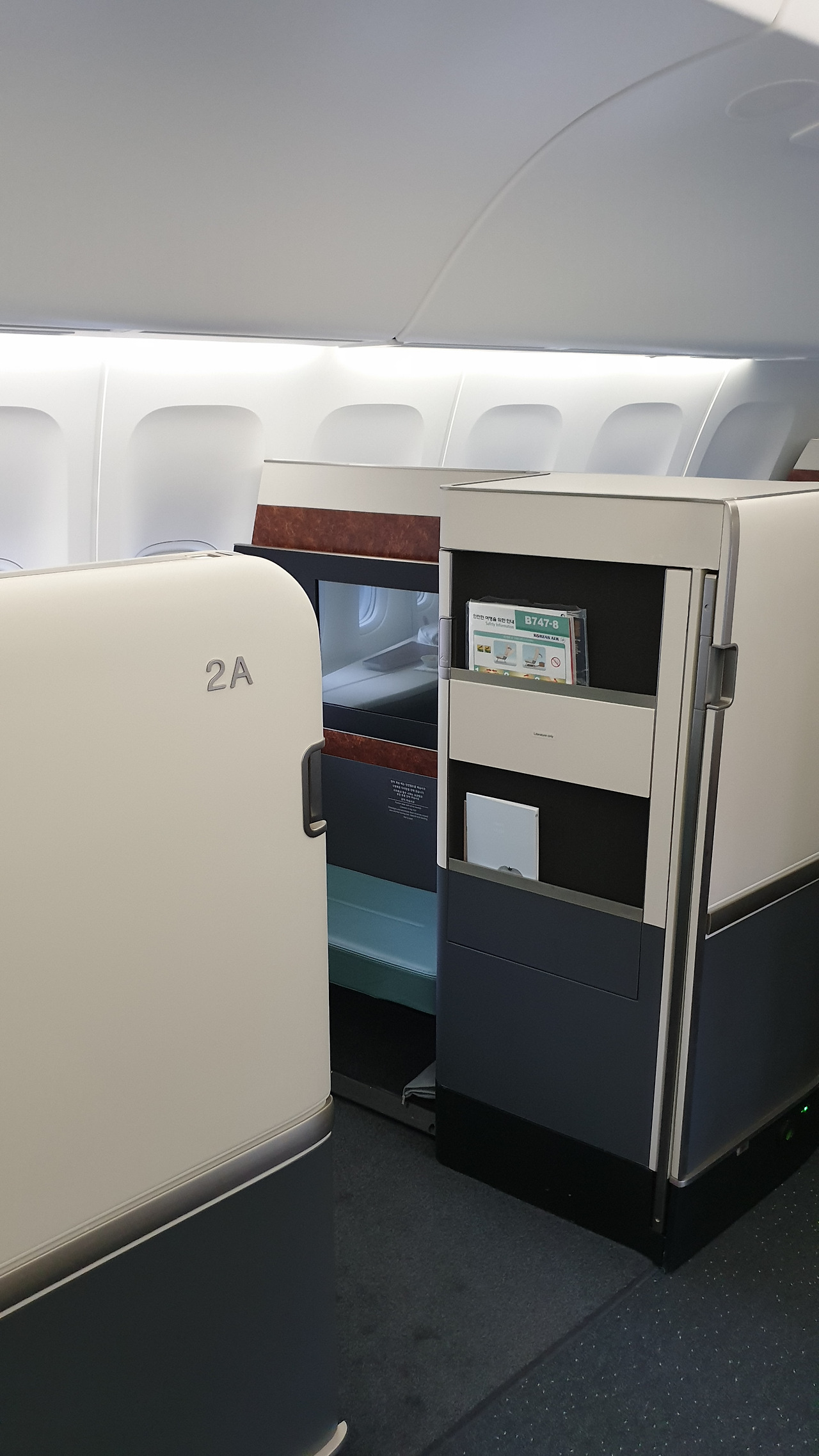 배정받은 2A 좌석입니다. 코스모스위트 1.0은 옆이 트여 있어서 2A에 앉아 있으면 이착륙 시 스크린을 낮춰두면 반대편 2J에 앉은 사람을 볼 수 있는데 2.0은 저렇게 파티션이 되어 있어서 복도를 이동하는 승무원 분을 제외하고는 다른 사람은 아예 보이지 않아 프라이버시가 보호되는 듯한 느낌입니다.