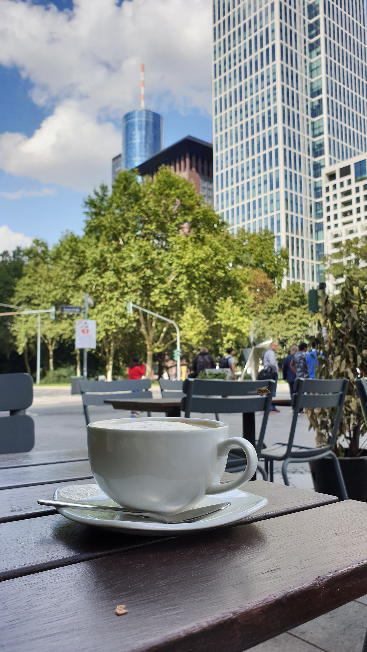 이번 여행 여정은 런던 - 에딘버러 (글래스고 당일치기 포함) - 쾰른 - 프랑크푸르트 였는데 프랑크푸르트는 정말 교통 허브란 평가가 무색하지 않게 영국 여정보다는 재미가 없었습니다 ㅠㅠ 공항 가기 직전 유로타워 앞에서 아쉬움이 잔뜩 묻어 있는 라떼를 마시며 한국으로 돌아갈 마음의 채비를 합니다.