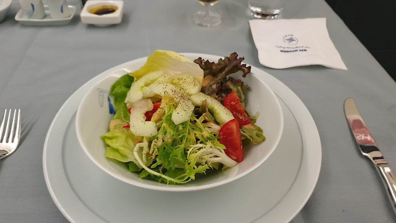캐비어 전채를 먹고 나니 스프가 나오고... 아쉽게 스프가 짜서 많이 먹진 못 했습니다. 스프로 배를 채우려는 생각은 없었어서 별 생각 없이 많이 남겼는데 나중에 승무원 분이 오셔서 간을 잘 못 맞춰드린 것 같다고 죄송하다고 말씀하시더군요. 쿨하게 '아우 괜찮습니다 스프는 육지에서도 많이 먹을 수 있는걸요 핫핫' 하고 대답했습니다. 대신 샐러드를 더 신경써서 만들어 주신 느낌. 사우전 아일랜드 드레싱을 얹어서 맛있게 먹어봅니다.