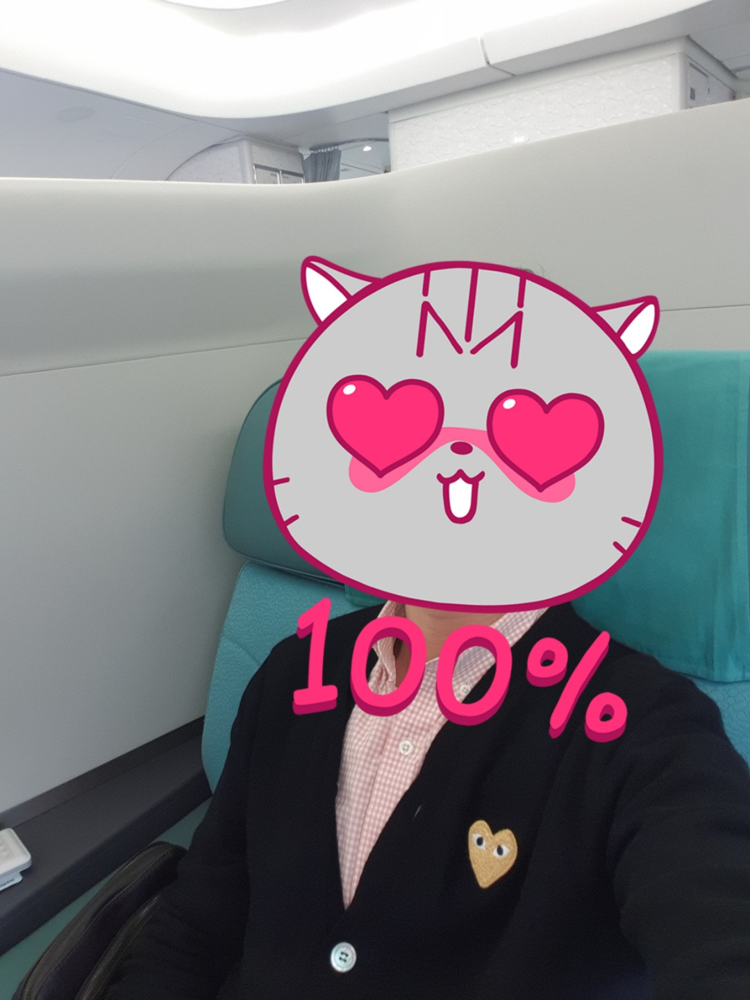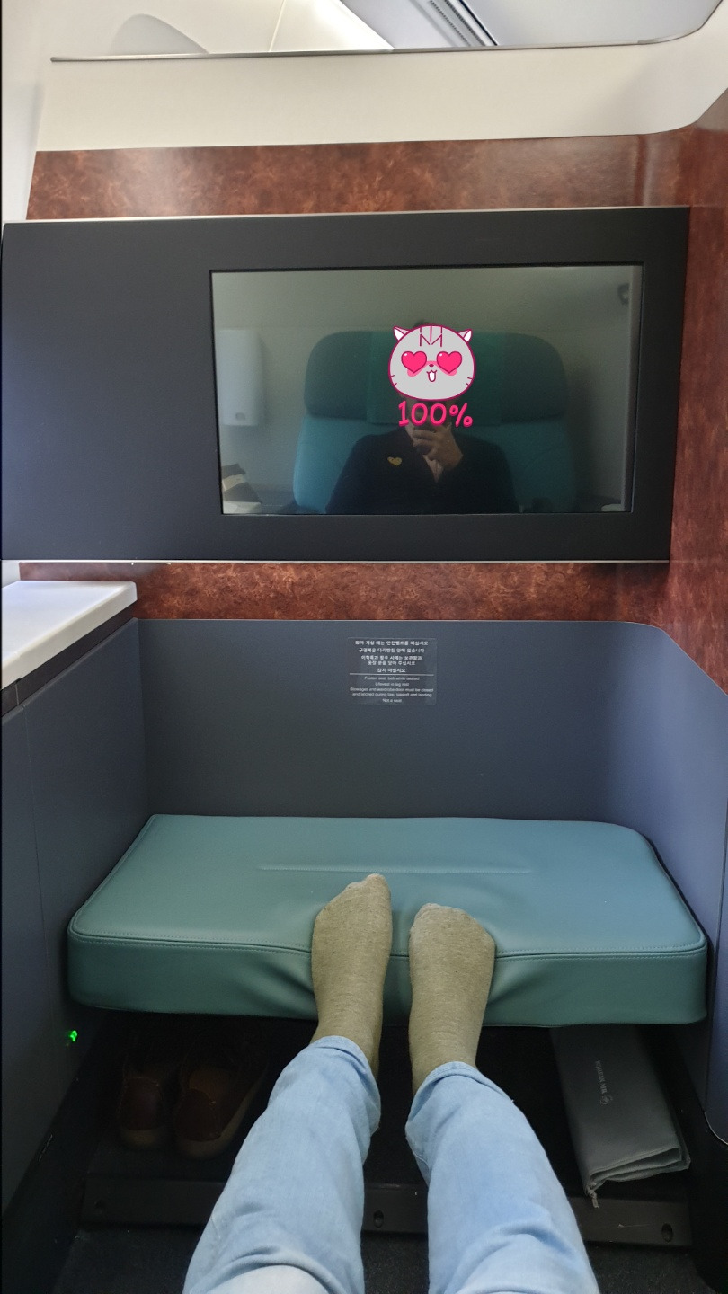 좋은 자리에 앉으면 역시 흥분이 됩니다. 비행기를 처음 타 보는 어린 아이처럼 마구 사진을 찍어 봅니다. 셀카를 찍으면 머리 뒤로 높은 파티션이 코스모 스위트 2.0 자리가 얼마나 프라이버시 완성을 위해 만들어 졌는지 짐작이 가능합니다.