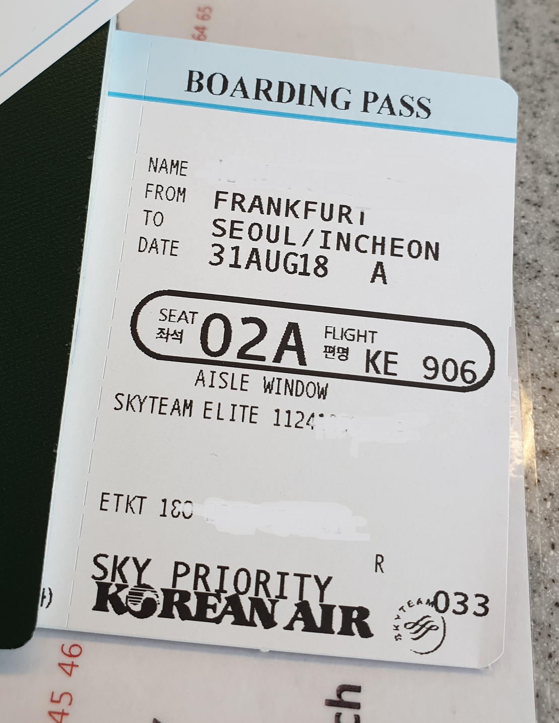 갈 때도 그렇듯이 1열보다는 2열이 더 전후 폭이 크고 편하다는 추천에 따라 이번에도 2A 좌석 배정을 받았습니다. 프랑크푸르트 공항에는 대한항공 KAL 라운지는 없고, Priority Lounge 라는 곳에 위탁을 주어 운영하고 있었습니다. 해당 라운지 입장을 위해 청자색이 은은한 라운지 입장 카드를 받았습니다. 테러 위협 때문인지 출국심사 줄이 길어 30분 넘게 기다리면서 마음은 이미 라운지에 가있는데 몸은 땀과 함께 누더기가 되어 갑니다.
