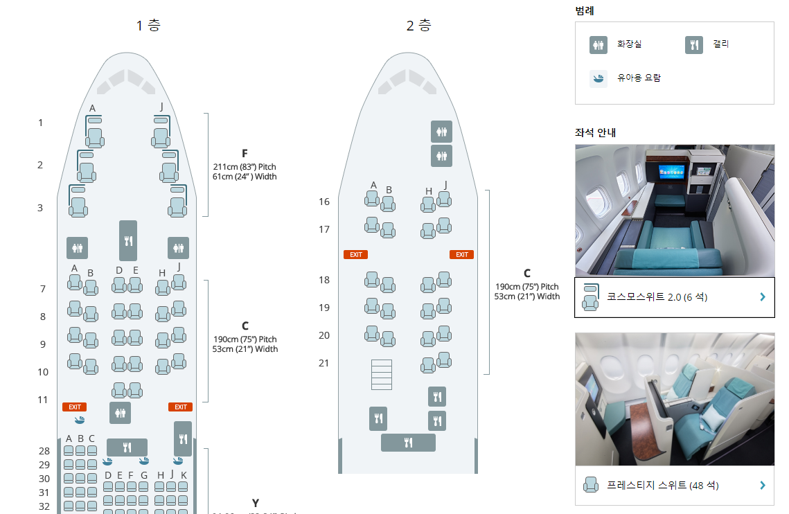 A380은 코스모스위트 1.0 일등석이 12자리가 촘촘하게 붙어 있지만 B747-8i 는 위 그림에서도 보시듯이 코스모스위트 2.0 좌석이 1층 맨 앞에 6자리가 여유 있게 배치되어 있습니다. 좀 더 조용하고 프라이버시를 보장받을 수 있다는 느낌일까요...