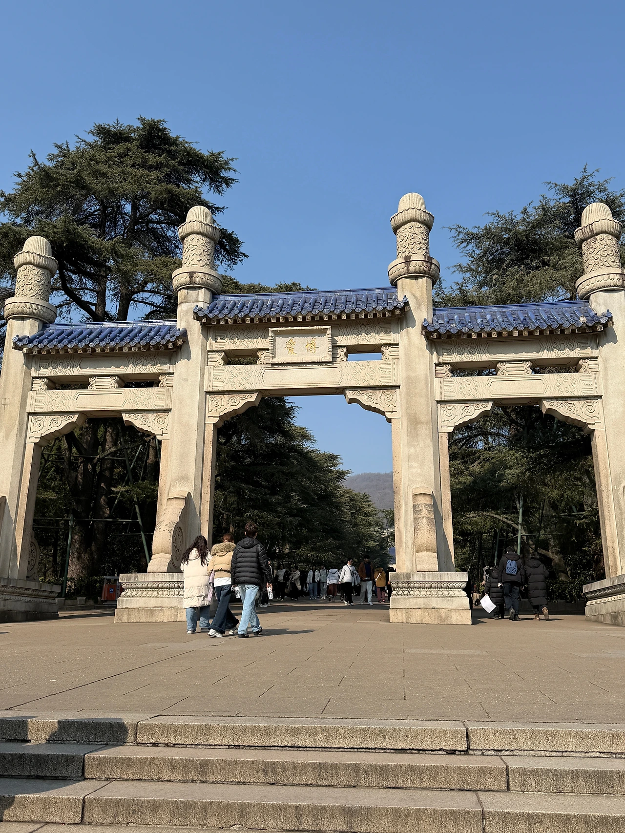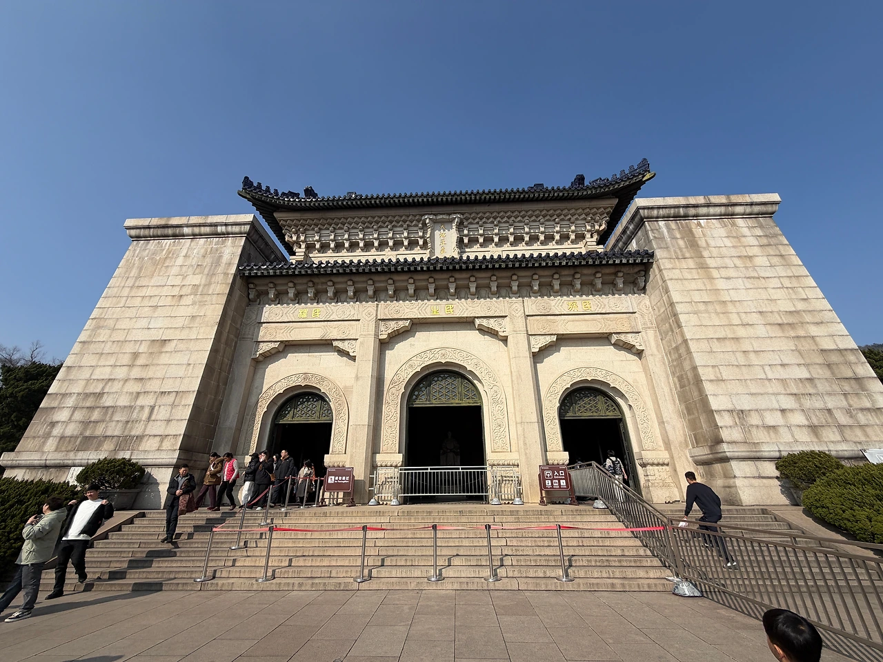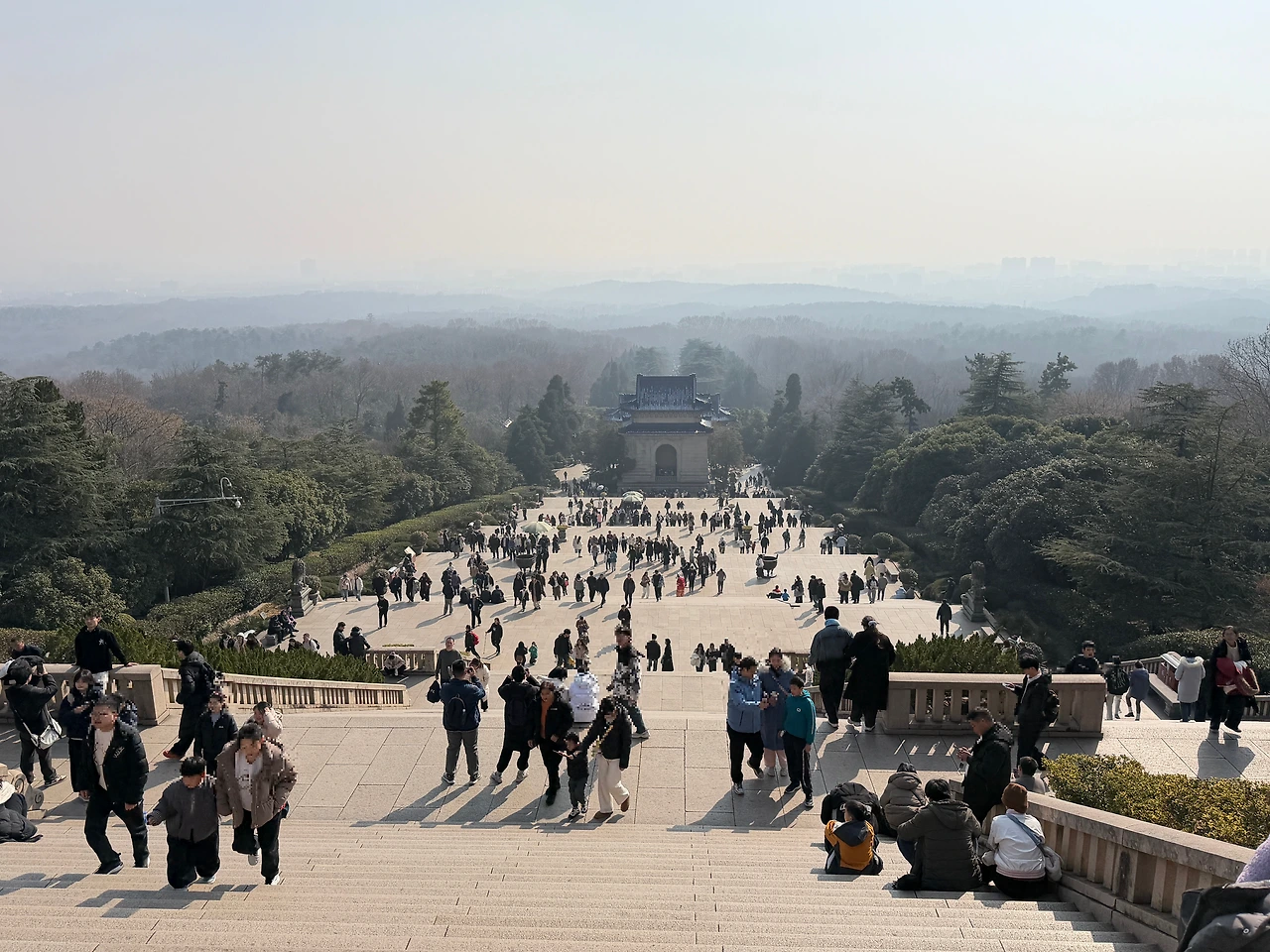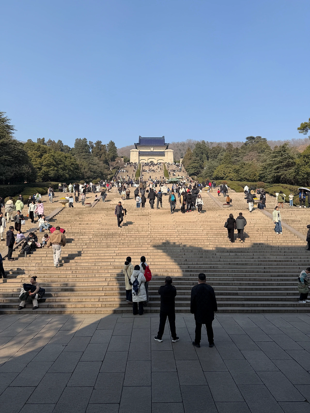 392개의 계단이 기다립니다. 저 멀리 제당까지 이어지는 계단 수는 당시 중국 인구였던 3억 9천 2백만 명을 상징한다고 합니다. 계단을 올라갈 때는 가파른 계단만 보이지만, 꼭대기에서 아래를 내려다보면 신기하게도 계단은 사라지고 평지만 보입니다. 이는 "고난을 이겨내면 평탄한 미래가 온다"는 철학적 메시지를 담고 있습니다. 일제의 난징 침공 당시 중산릉도 파괴될 뻔 했었는데요, 시가전 때문에 포격은 받았으나 다행히 유적이 다치진 않았다고 합니다. 쑨원이 지금도 대만의 국부이자, 중국 본토에서도 상당히 존경받는 인물인데 당시에 일본에서도 흠모하는 사람이 많았고, 이미 대학살과는 별개로 중산릉까지 공격했을 때 중국 민심이 돌이킬 수 없을 걸 우려한 군부가 묘 훼손 못 하도록 철저히 지시했다는 이야기가 있습니다.
