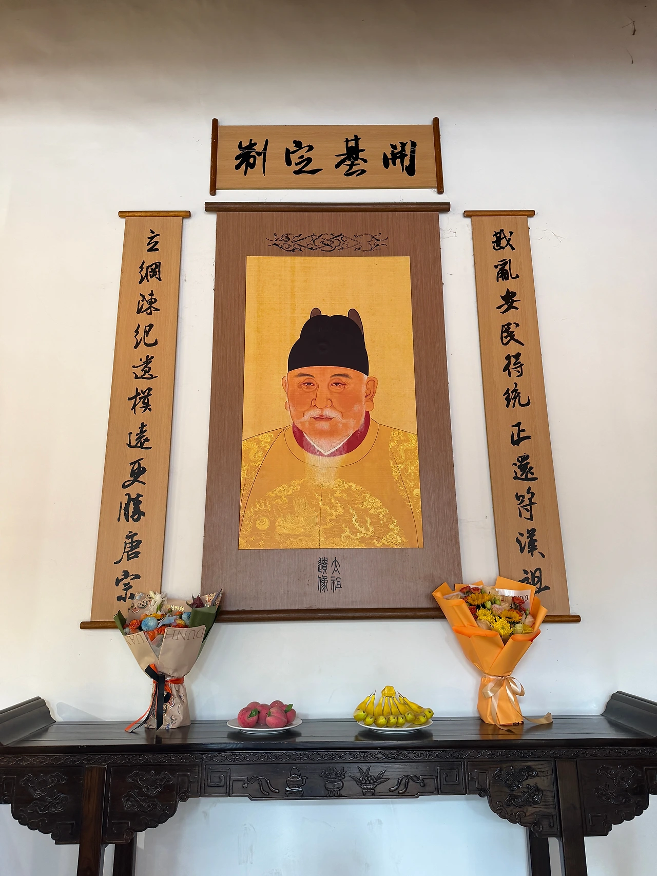 명효릉 향전 기둥에 새겨진 이 글귀들은 명나라를 세운 주원장이 역사적으로 어떤 평가를 받는 인물인지를 아주 명쾌하게 보여줍니다. 우선 오른쪽 사진 우측 한자 내용은 그가 맨주먹으로 일어나 난세를 평정하고 백성을 구제한 행보가 중국 역사상 대표적인 평민 출신 황제인 한나라 고조 유방의 창업 정신과 꼭 닮아 있다는 점을 칭송하고 있습니다. 이어지는 왼쪽 글귀는 주원장이 단순히 나라를 세우는 데 그치지 않고 국가 운영의 기강과 법도를 아주 치밀하게 설계했음을 강조하는데, 이는 중국 역사상 최고의 성군으로 꼽히는 당나라 태종 이세민보다도 훨씬 더 신중하고 멀리 내다보는 안목을 가졌다는 극찬을 담고 있습니다.