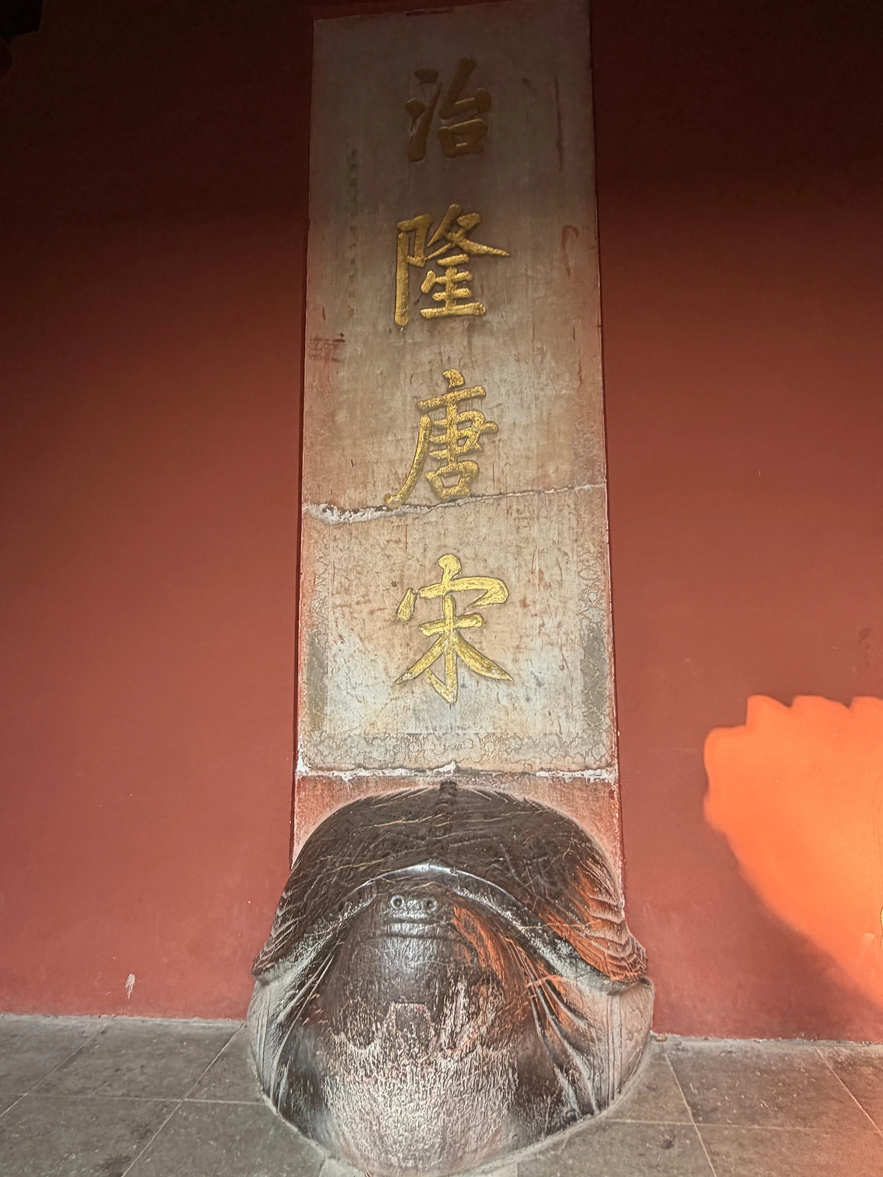 왕릉에 온건데 갑자기 눈 앞에 엄청난 높이의 망루가? 저 망루 건물이 명루(明樓)라고, 야산 크기의 무덤 앞을 지키는 최종 보스 역할 느낌으로 지어져 있습니다. 명루는 높고 견고한 석조 성벽 위에 자리 잡고 있습니다. 붉은 벽면과 황금빛 기와가 어우러진 이 2층 규모의 누각은 황실의 권위와 존엄을 상징한다고 합니다. 과거 전란으로 인해 지붕이 소실되어 성벽만 남았던 아픈 역사가 있었으나, 최근 세심한 복원 과정을 거쳐 지금의 화려한 모습을 되찾았대요. 고종 황제가 대한제국 수립을 선포하고 나서 황제의 무덤이 명효릉 정도는 되어야 되지 않겠냐며 사람을 난징으로 파견해서 자기의 무덤을 미리 벤치마킹하라고 했다는 이야기가 있네요.