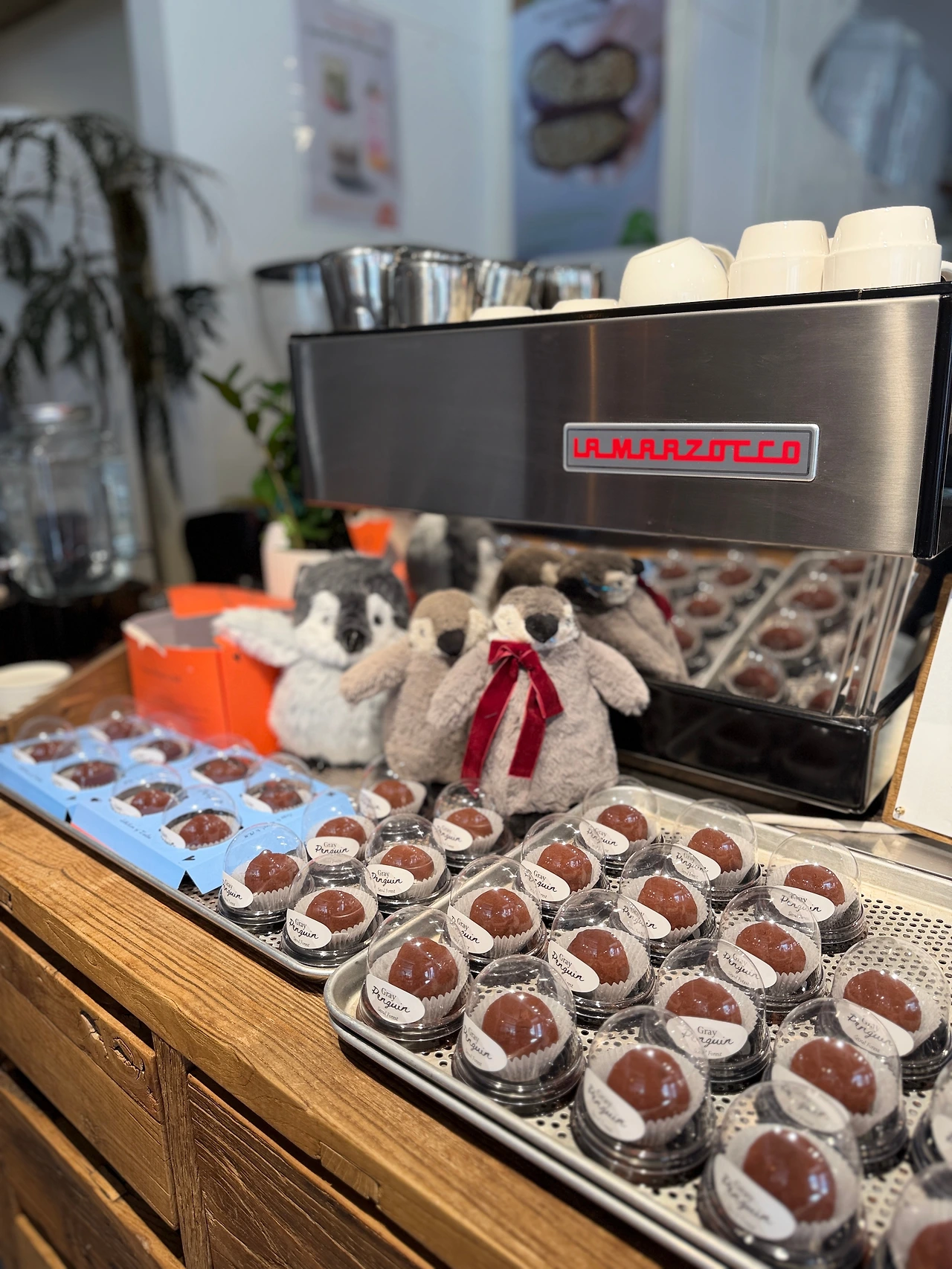 마르조코 머신 앞에 놓인 두쫀쿠들.. 제 주변에서는 가격 많이 내리던데 아직은 여긴 7천원이라서 패스 ㅠㅠ 커피는 무난하게 맛있었구요. 두바이 스프레드 타르트 먹고 싶었는데 아이는 블루베리 타르트를 원해서 사주었습니다! 주말 오전 방문이라 한적하게 잘 즐긴 그레이펭귄 카페였습니다 추천!