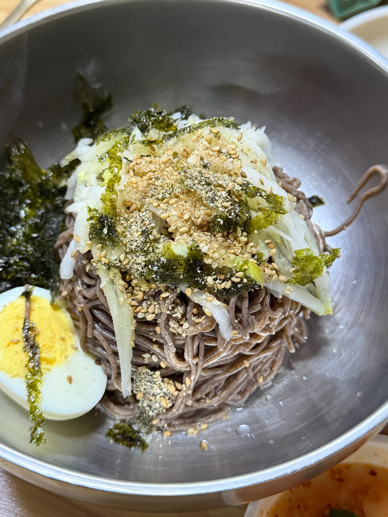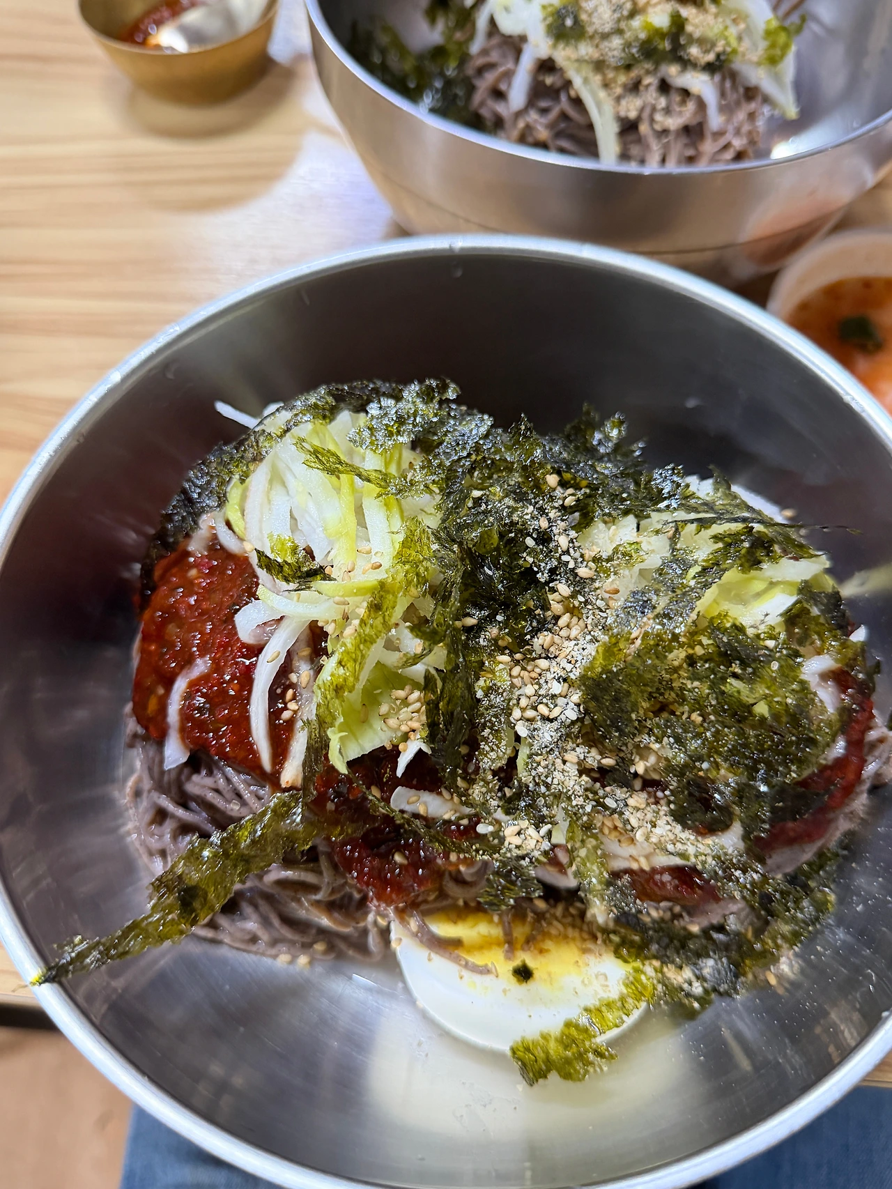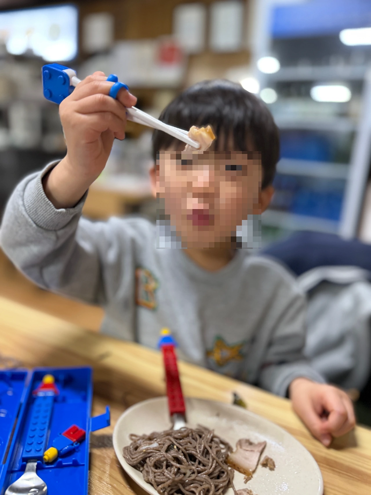 수육 대 자로 시키고 막국수 곱뺴기 하나, 그냥 막국수 하나 시켜서 배부르게 먹었습니다. 유소아 식기를 레고 스타일 제품을 제공해 주셔서 센스 있다고 생각!