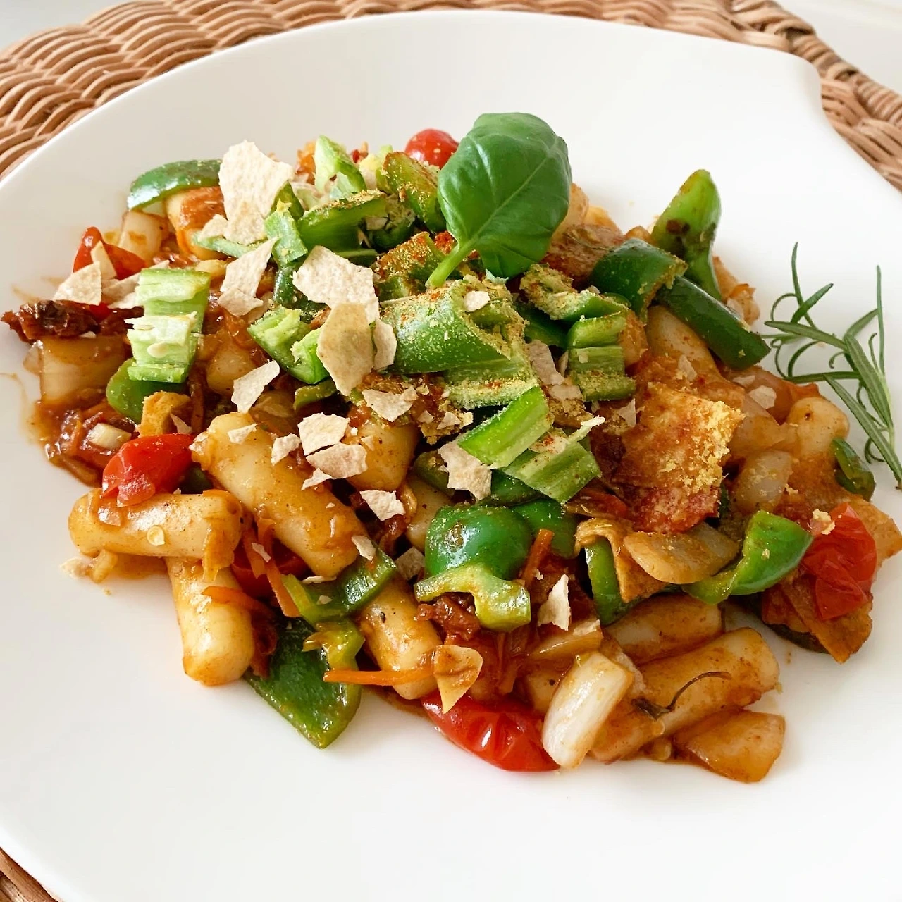 5. 떡이 노릇하게 구워지면 피망과 오이 고추를 넣고 볶다가 소스를 끼얹으면서 양념이 골고루 밸 수 있도록 뒤적이며 볶는다. (매운 맛을 원하면 풋고추나 청양고추를 썰어서 넣어도 된다.)