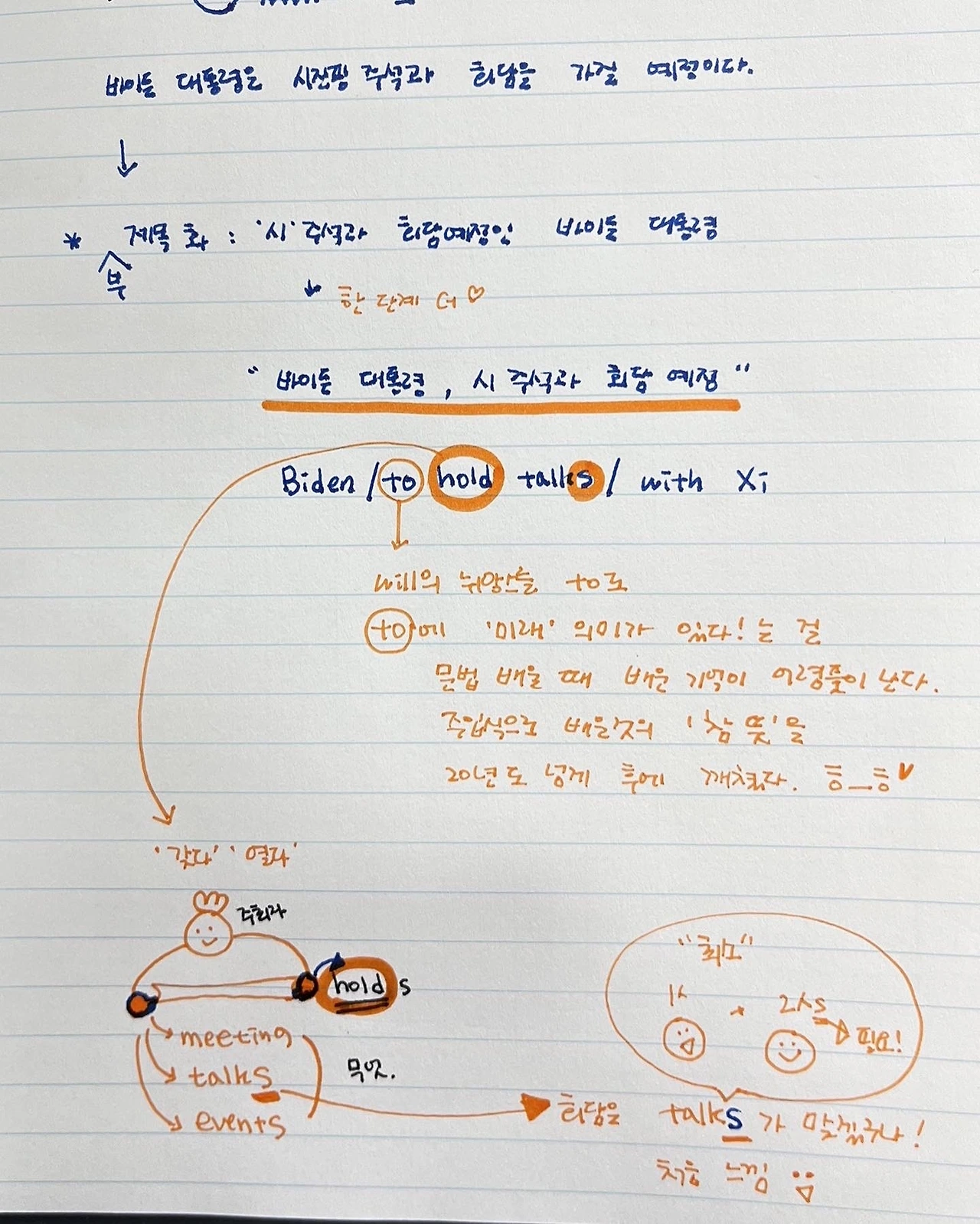 그리고 아무 생각없이 회담=talks 로 다소 기계적으로 치환하고 넘어갔는데, 오늘 유심히 보니, 아 최소 2인이 필요한 ‘말/대화(talk)’이라서 talks라고 하나보네? 라는게 느껴져서 재밌었어요.