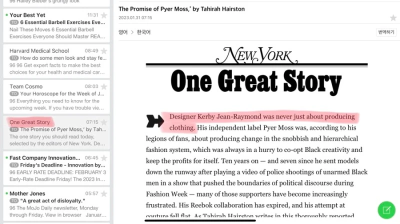 오늘은 메일함 제목을 보다가 제목 one great story가 왠지 좀 있어 보여서 클릭했어요. (0.1초 소요)