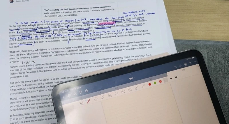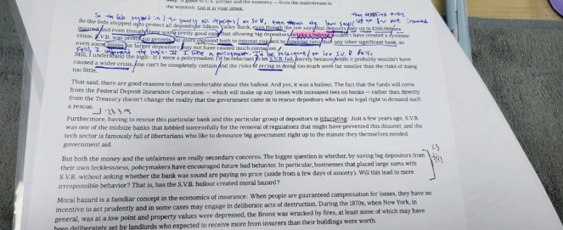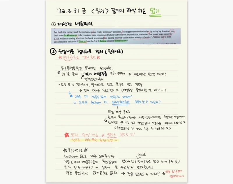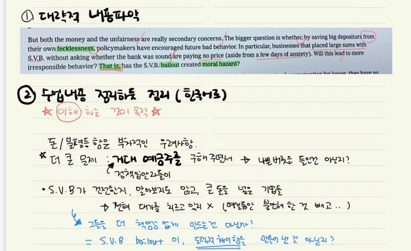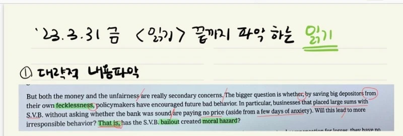 위의 사진은 2주 정도 전에 실리콘밸리 은행 사건 터졌을 때 고른 기사에요. 15일에 한 문단 하고, 한참 쉬다가 (이 사이에 영태기..ㅋㅋ) 31일에 한 문단 하고 표시해두었어요.