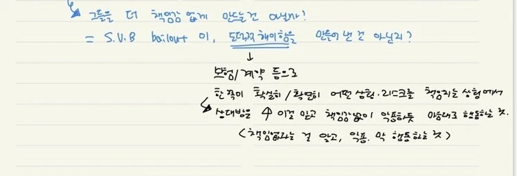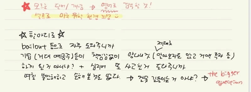 여기에서 저는 fecklessness라는 단어, 그리고 bailout과 도덕적 해이 (moral hazard)가 정확히 무슨 뜻인지 모르겠어서 찾아보기로 했어요. 많이 들어봤다고 내가 아는 건 아니기 때문에, 얼렁뚱땅 알겠지~하고 넘어가지 말고 잘 구분해야 합니다. 나에게 좁쌀영감처럼 꼬장꼬장하게 계속 물어봐야 해요. “정말 알아?” “진짜 쉽게 설명해 봐.” 등.