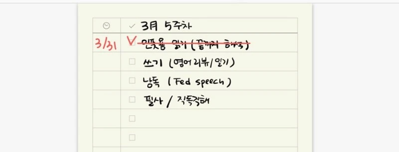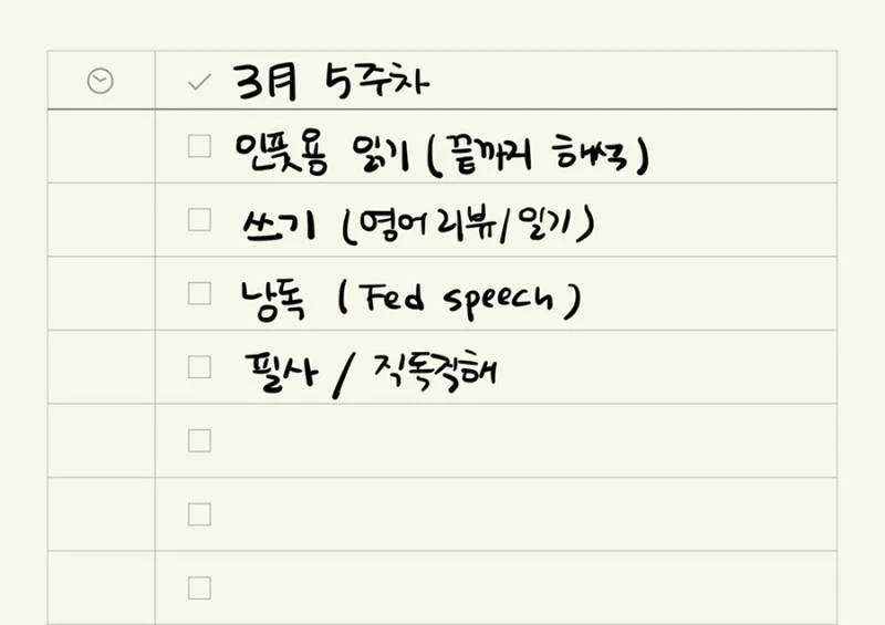 저의 이번 주 리스트에요. 전 오늘 인풋용 읽기(독해)를 골랐어요.