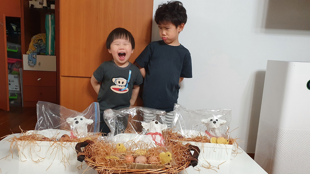 아이들은 부활절의 의미를 잘 모른다. 죽음이 뭔 지도 잘 모르는데 부활이라니, 그저 엄마와 케이크를 만들고 달걀을 꾸미는 신나는 날이다. 두번 했더니 내년 부활절에도 당연히 하는 줄 안다. 두 해 동안 실력을 다듬었으니 내년에는 안나의 집 김하종 신부님께 한 마리 갖다 드려야겠다.