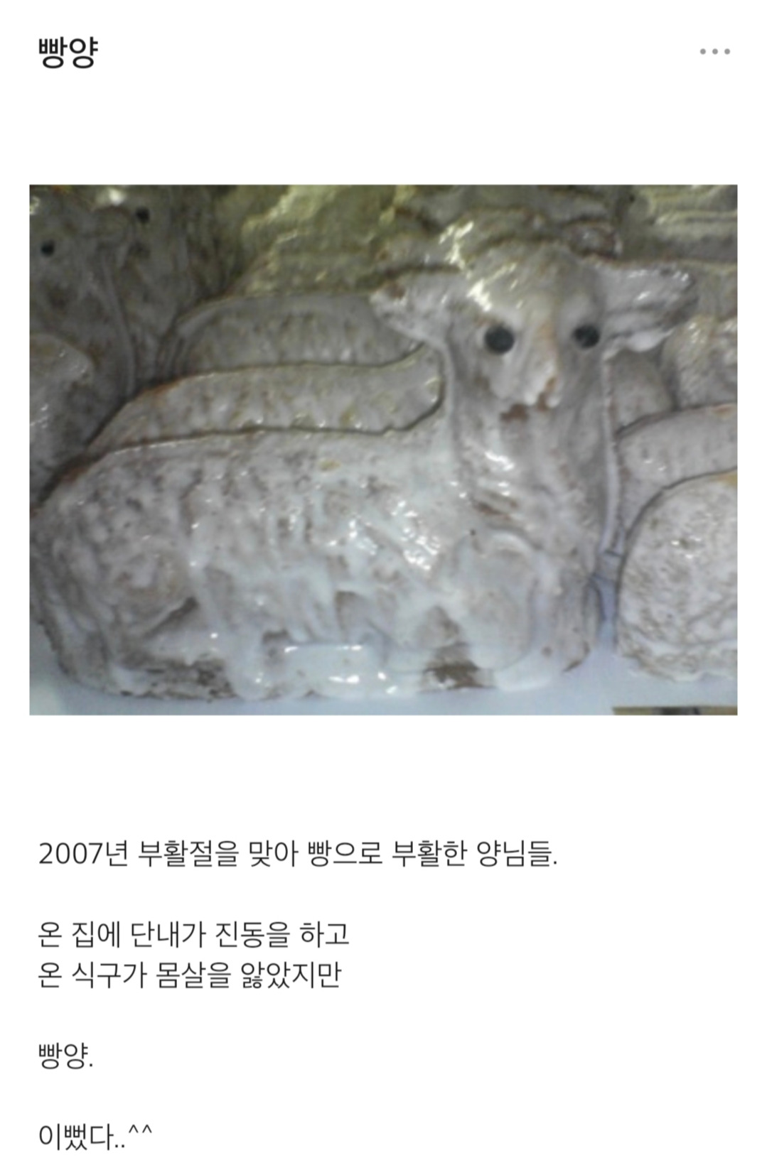 그게 20년 전이다. 지금도 그렇지만 그 때는 부활절에 양 케이크를 보는 사람마다 눈이 휘둥그레졌다. 처음 보는 빵이라고.서양에서는 부활절이면 흔하게 보이는 케이크 라는데 사실 우리도 몰랐다. 그저 그 수녀원의 전통인 줄만 알아서 성남에 안나의 집 이라고 노숙인 무료 급식소를 운영하시는 이태리 출신의 김하종 신부님께서 (엄마와는 오랜 지인) 하나 구워달라고 부탁 하셨을 때 도 고지식한 엄마는 칼같이 거절 하셨다. 그 수녀원만의 전통이라고, 이 빵틀로 만든 빵은 수녀원에 저작권이 있으니 내 마음대로 줄 수 없다고. 신부님께서 내가 이태리 휴가 가서 빵틀 사오면 구워줄꺼냐며 못내 아쉬워 하셨다는건 몇 년 전에 알았다. 그건 마치 외국 나가 사는 한국 사람이 추석 명절에 솜씨 좋은 외국 친구가 만든 송편 하나 나도 좀 달라는데 이건 이 Temple 의 전통이니 안 된다고 거절당한 것과 같은 기분이었을까. 한국에선 아무데서나 파는 송편을?