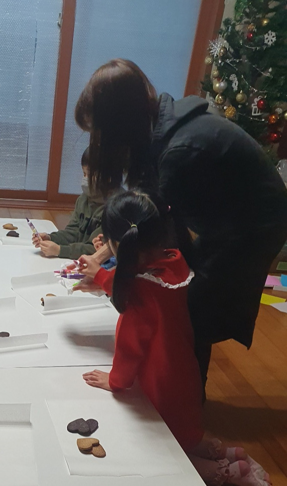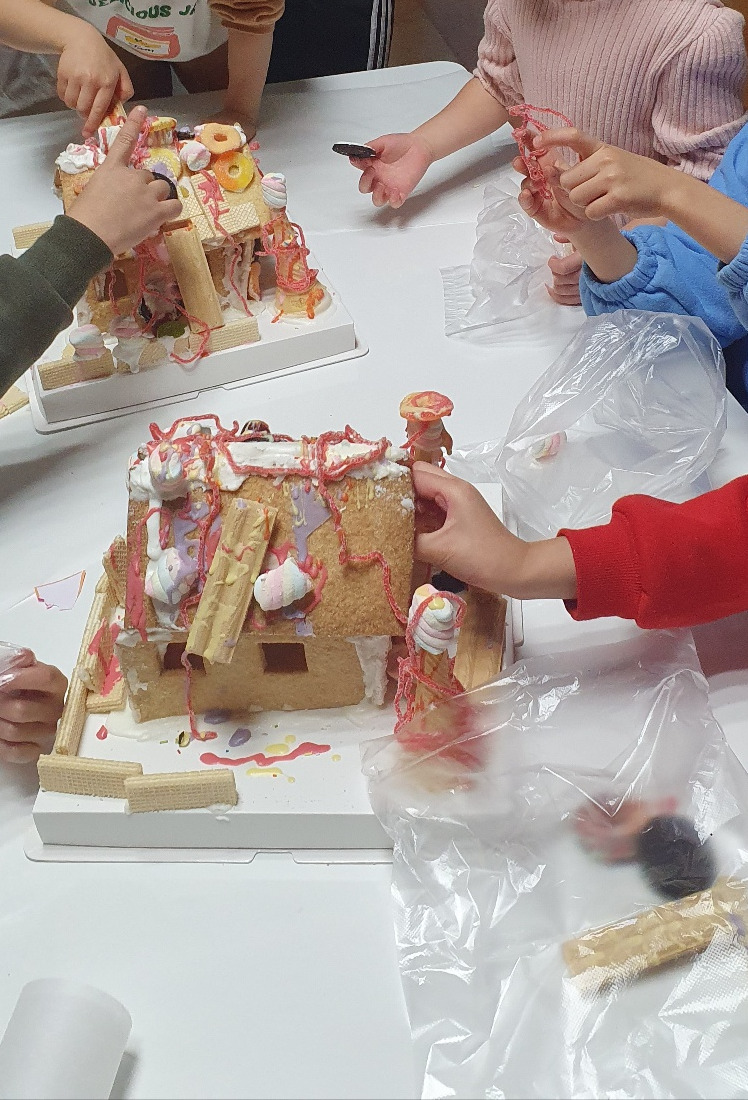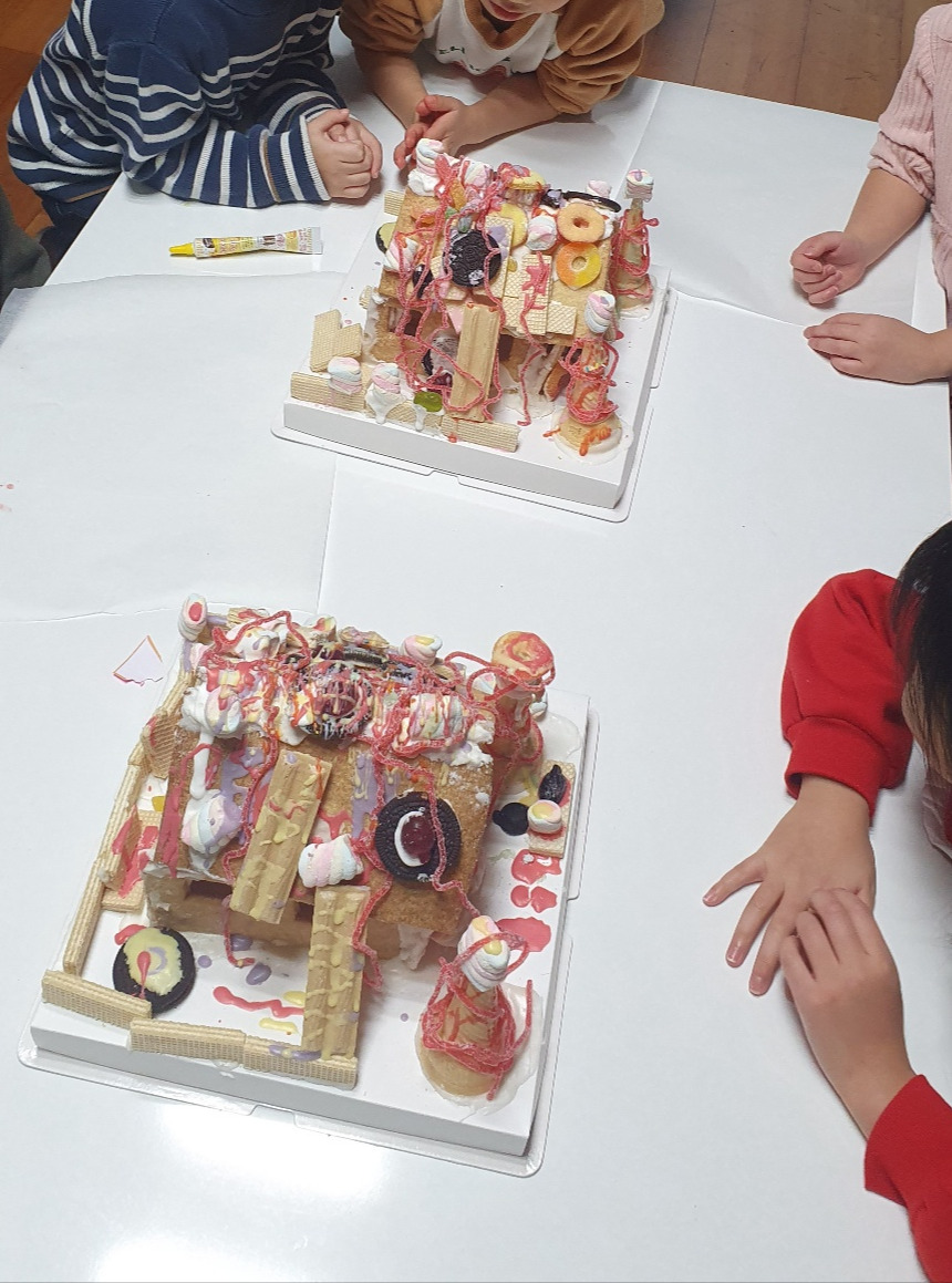 과자집은 슈가파우더에 레몬즙과 계란 흰자를 소량 넣은 아이싱을 뻑뻑하게 만들어 풀 처럼 사용하여 붙인다. 그 슈가파우더는 가루도 엄청 날리긴 하지만 달기도 엄청 달아서 나는 도저히 먹을 수가 없던데, 아이들은 정말 신나게 먹고 남은 걸 싸 갔다. 채소의 쓴맛은 더 쓰게 느껴 괴로워 못 먹는다는 아이들의 입맛이라더니, 설탕의 단 맛이 더 달게 느껴지는 건 괴롭지 않은가 보다. 아니면 과자집 그 자체로 즐거웠는지.