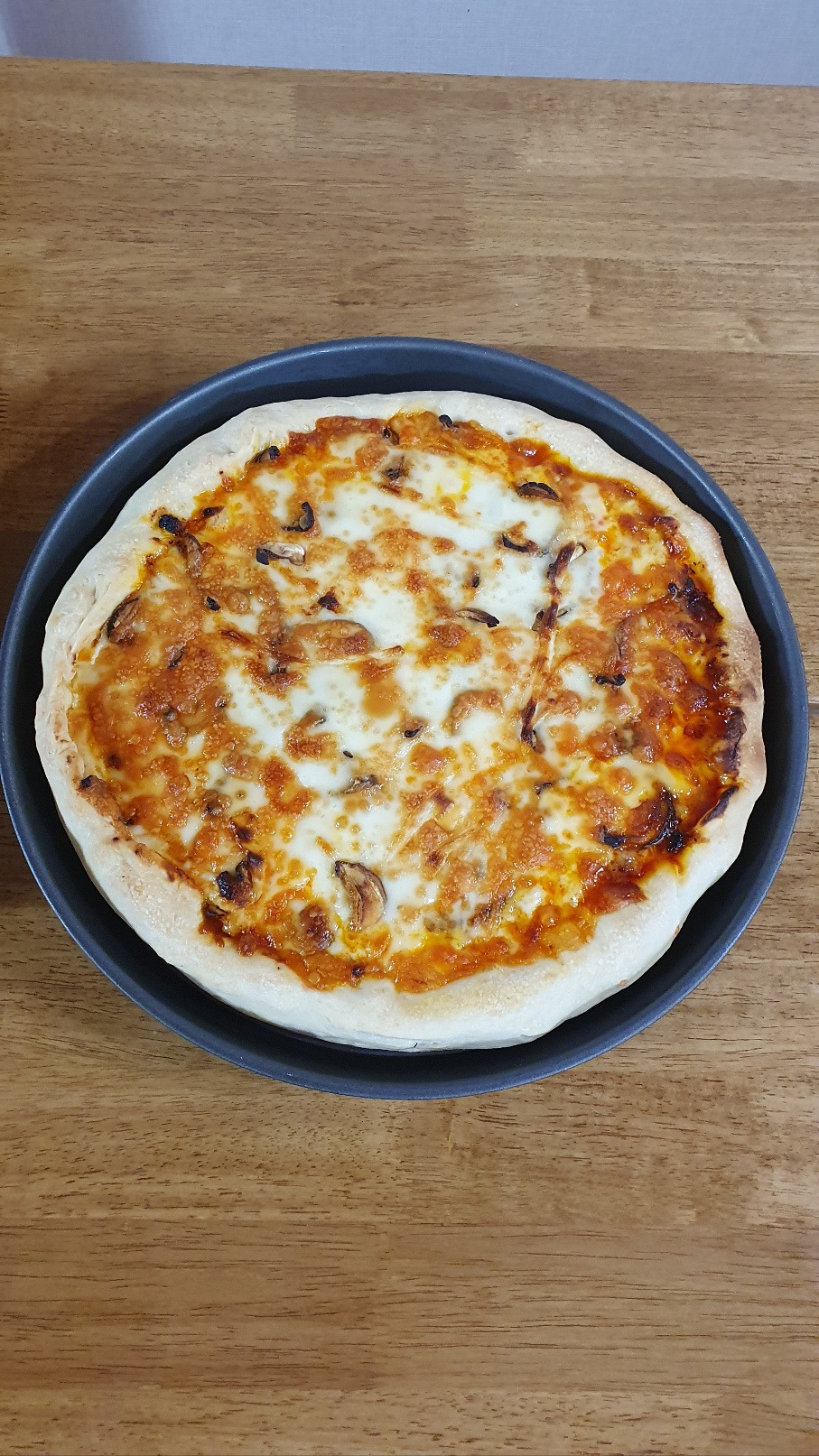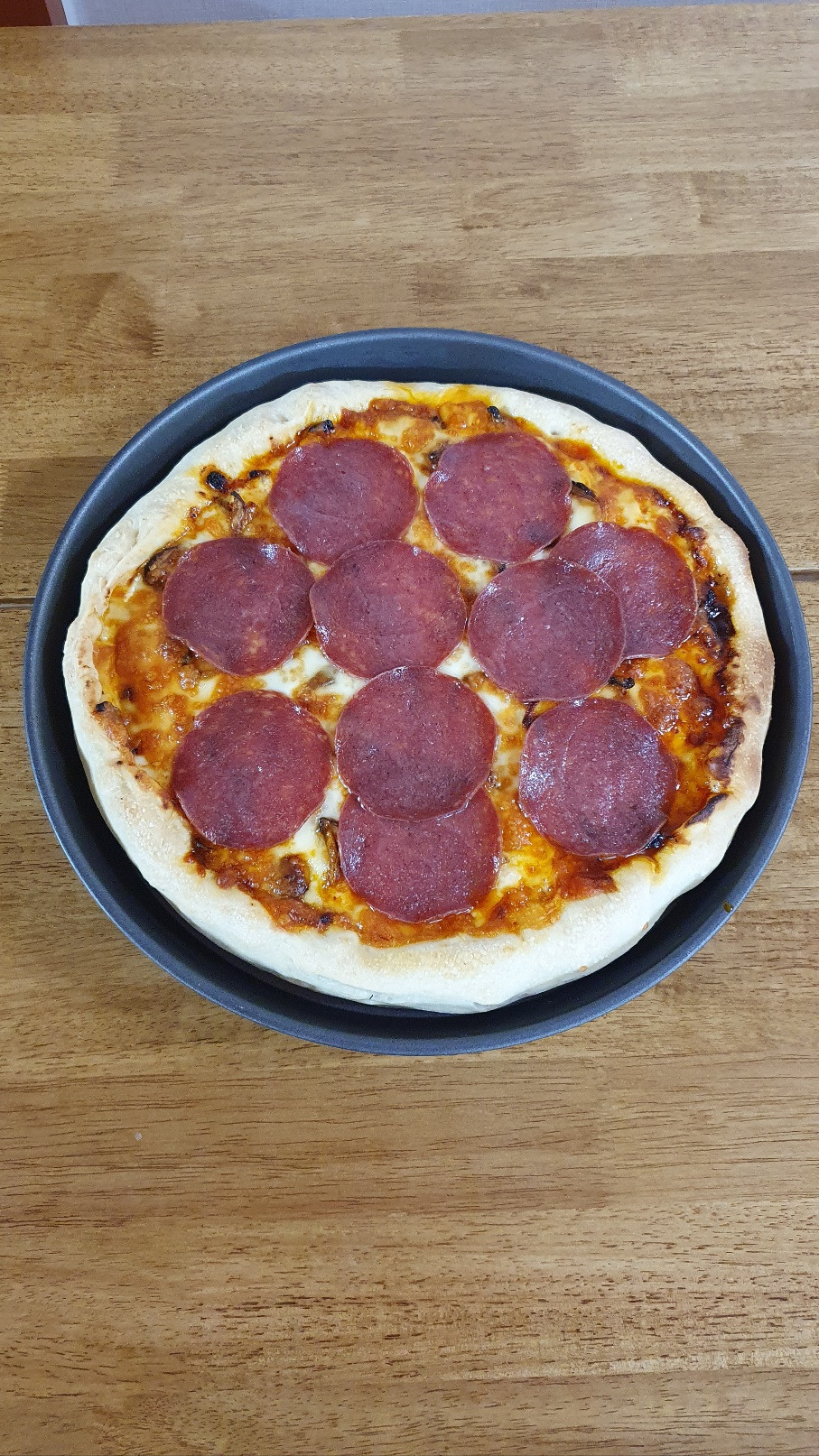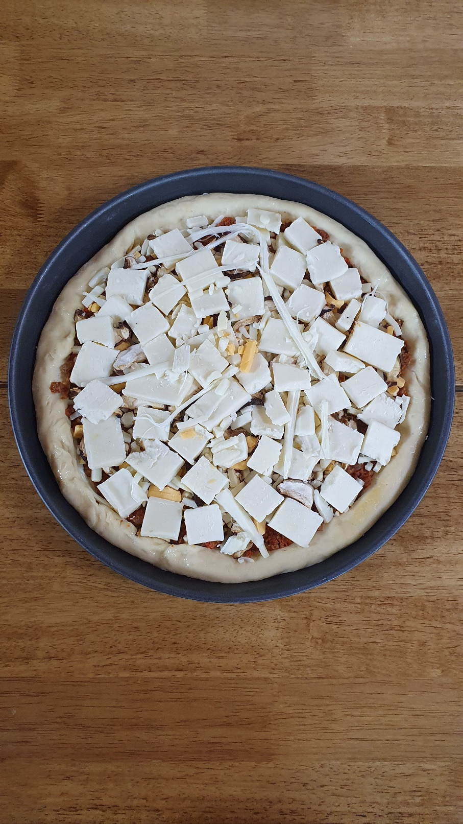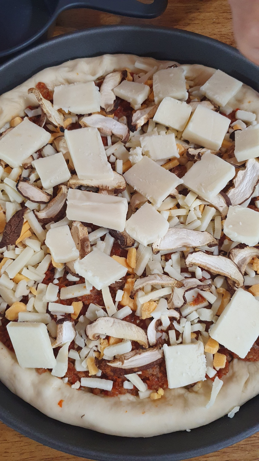 토마토 페이스트에 다진 소고기와 볶은 양파를 잔뜩 넣어 만들어 놓은 소스를 꺼냈다. 일반적인 피자소스와는 다른 든든한 비주얼, 소스를 얇게 한 번 바르는 게 아니고 두껍게 이불처럼 깔았다. 아이들의 음식을 만들며 아이들이 먹을 건 고칼로리, 고양양식으로 만드는 재주가 생겼다. 소고기 소스를 깔고, 테두리에는 스트링 치즈를 넣어 치즈 크러스트로 만들었다. 살짝 말려 얼려 둔 표고버섯, 덩어리 치즈와 피자치즈를 모두 총 동원하여 치즈 가득 올리고 한 번 구워 낸 후, 살라미를 올려서 조금 더 구웠다. 살라미는 너무 짜고 기름져서 안 올리고 싶었는데 아이들이 좋아한다. 마침 지난번에 피자를 해 먹고 남은 것이 조금 있어서 냉장고 재료를 다 털어버렸다.
