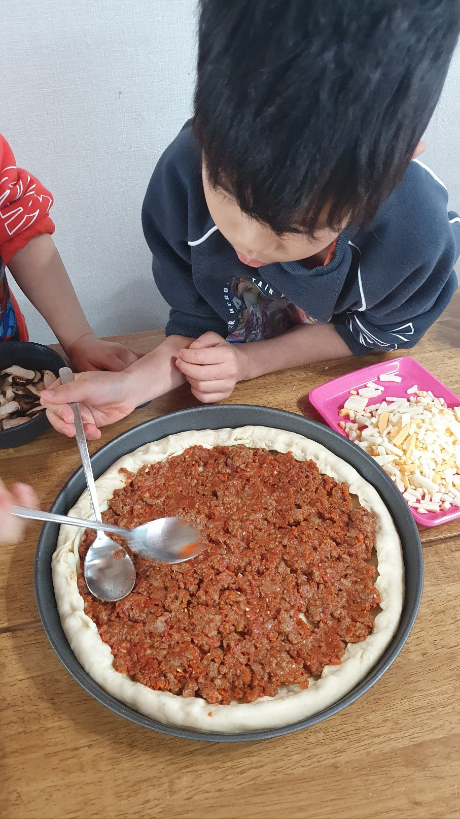 아이들이 요리를 도와주면 내가 할 일이 더 많아져 사실 도와주는 것이 아닌 게 될 때가 대부분인데 오늘의 피자 반죽은 정말 아이들이 도와주었다. 아들의 쓸모를 피자 반죽에서 찾게 되다니.