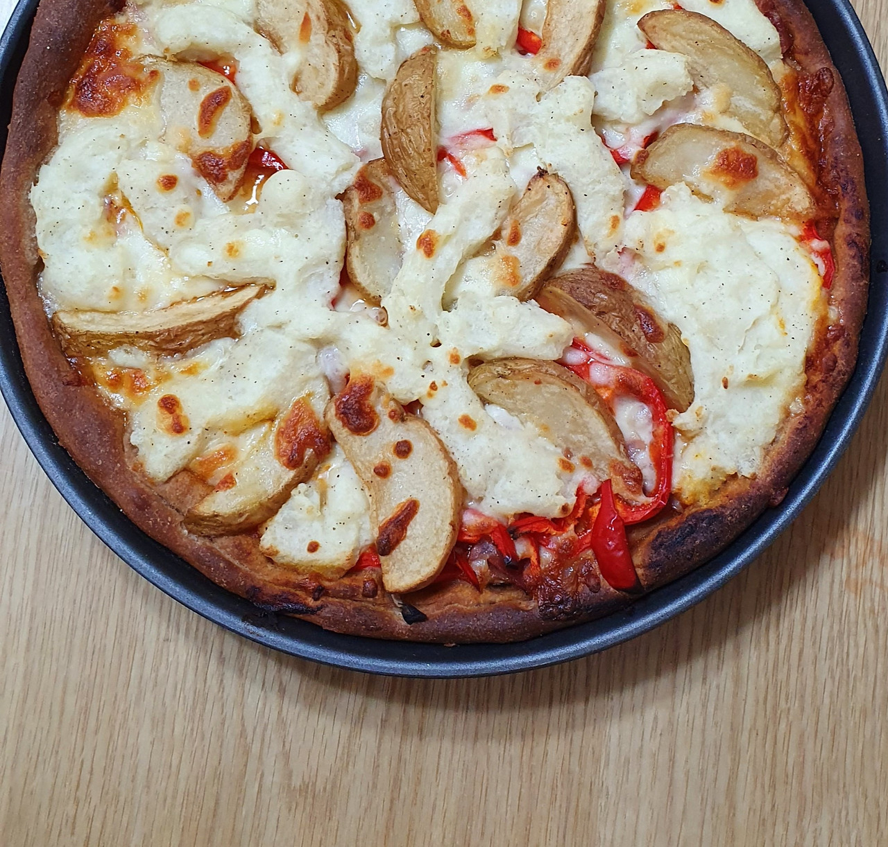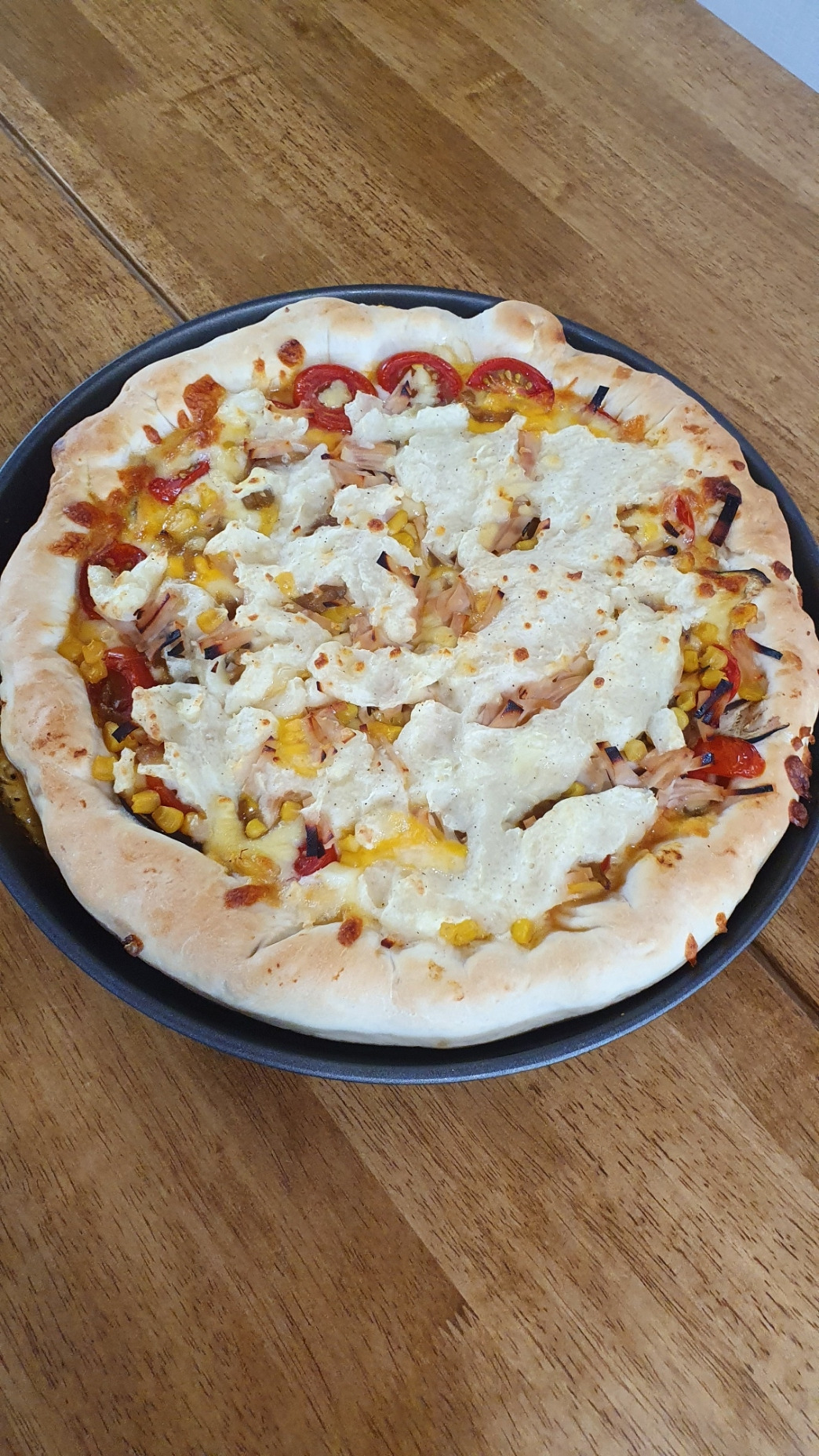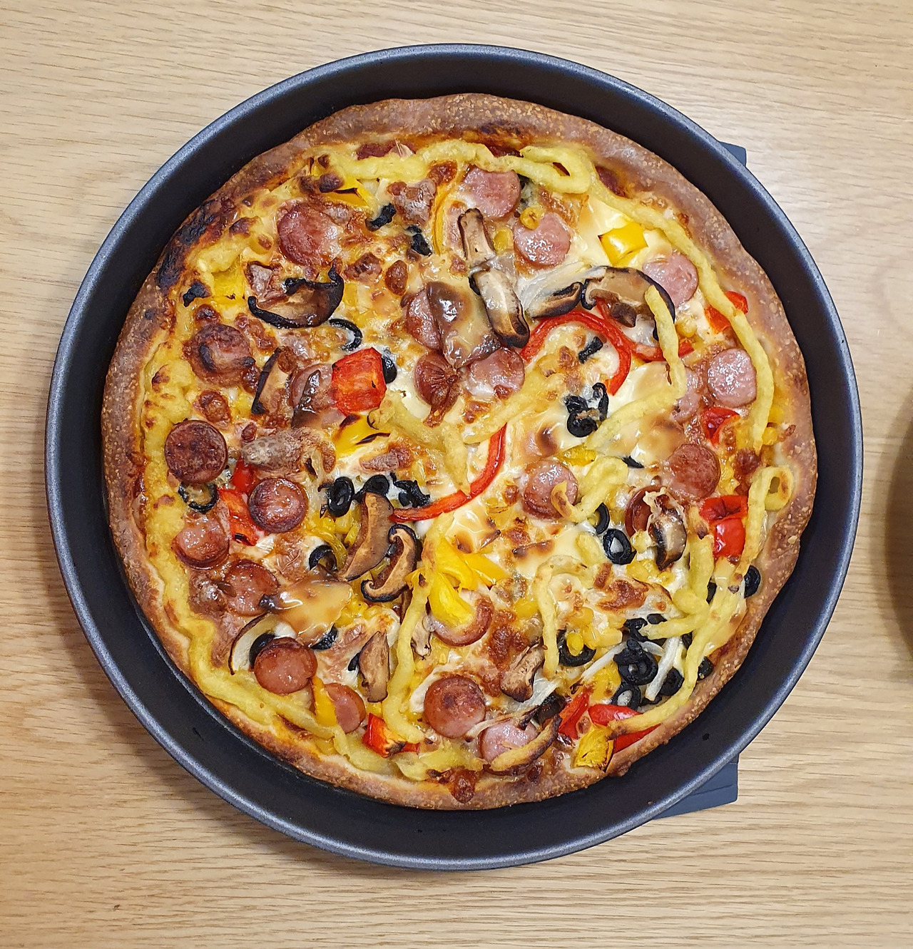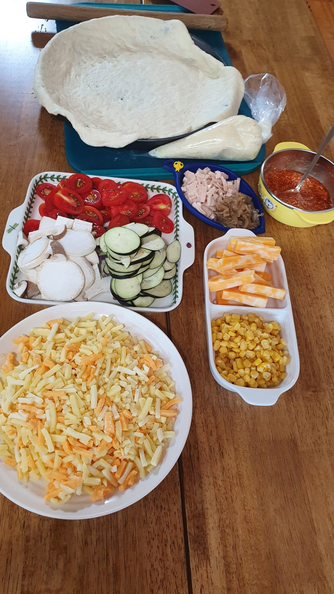 재료는 냉장고 사정에 맞추는 편인데 아이들이 좋아하는 통조림 옥수수는 꼭 넣어준다. 남편은 깡통을 까서 그냥 주지만 나는 한번 헹군다. 남편은 맛 없어진다고 질색을 하면서도 정작 헹구거나 안 헹군 맛을 구별하진 못한다. 오늘은 가지, 새송이버섯, 며칠 전 캬라멜라이징으로 볶아 둔 양파, 방울토마토, 닭고기 햄, 캔 옥수수, 싹이 난 감자를 도려내어 삶아 으깨 만든 감자무스를 준비했다. 마침 덩어리 치즈가 있어 오늘의 피자는 무려 치즈 크러스트다.