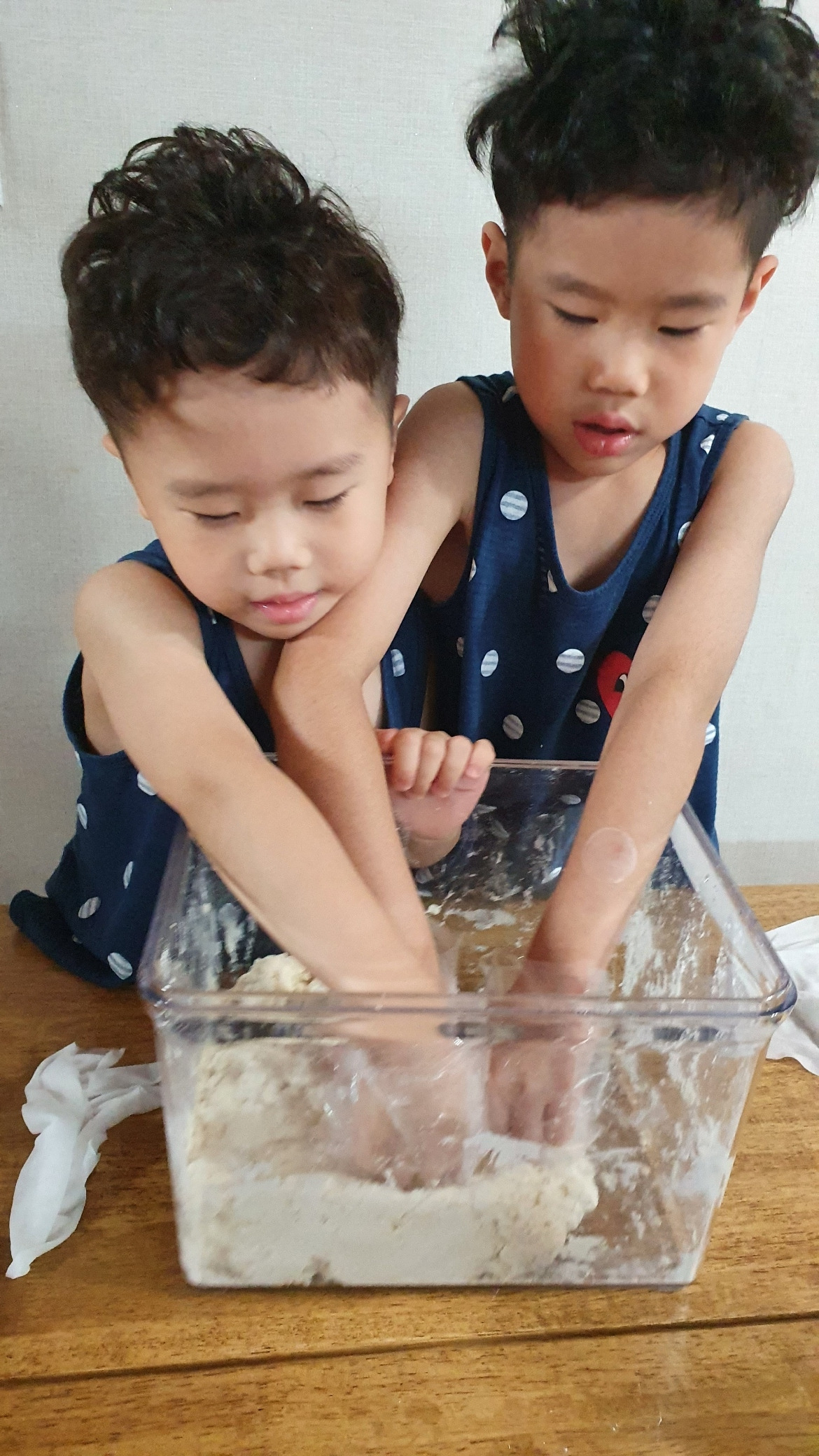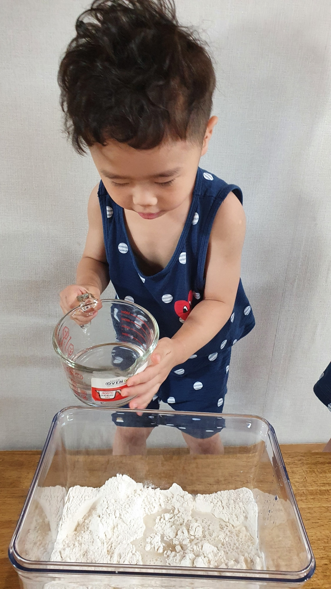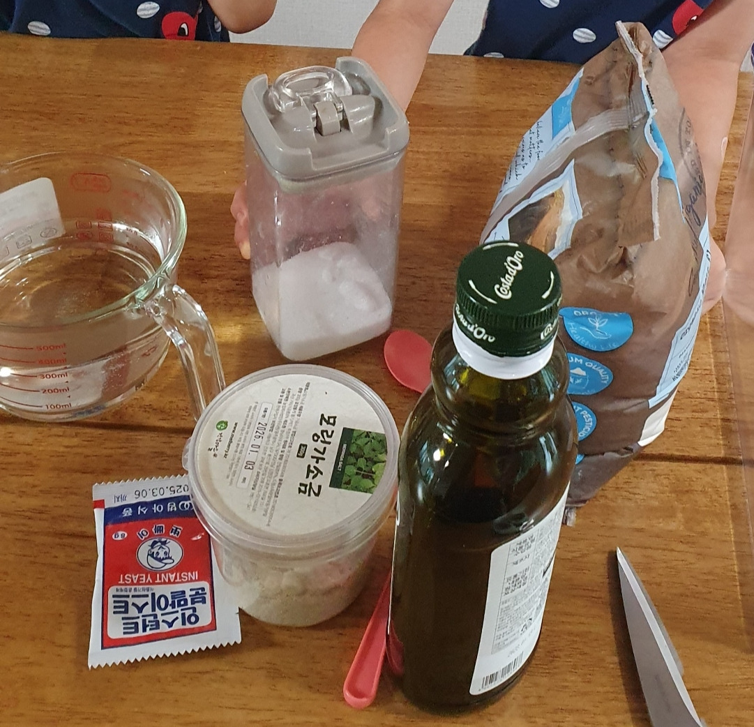 둘째가 저러다 계량 해 둔 물을 쏟아서 어쩔 수 없이 또 감으로 알아서 반죽했다. 서로 하겠다 난리인 뽀글머리 둘.
