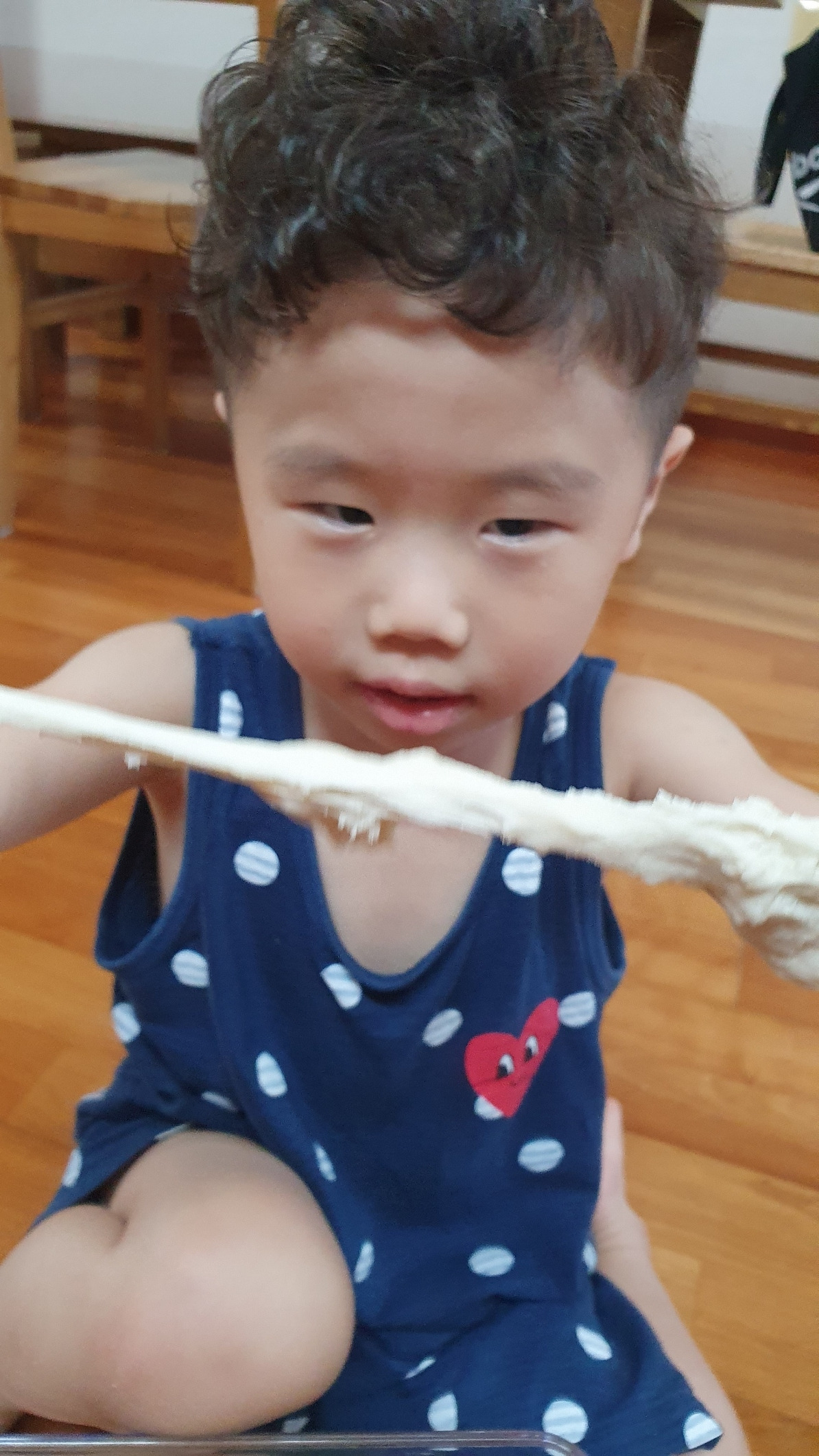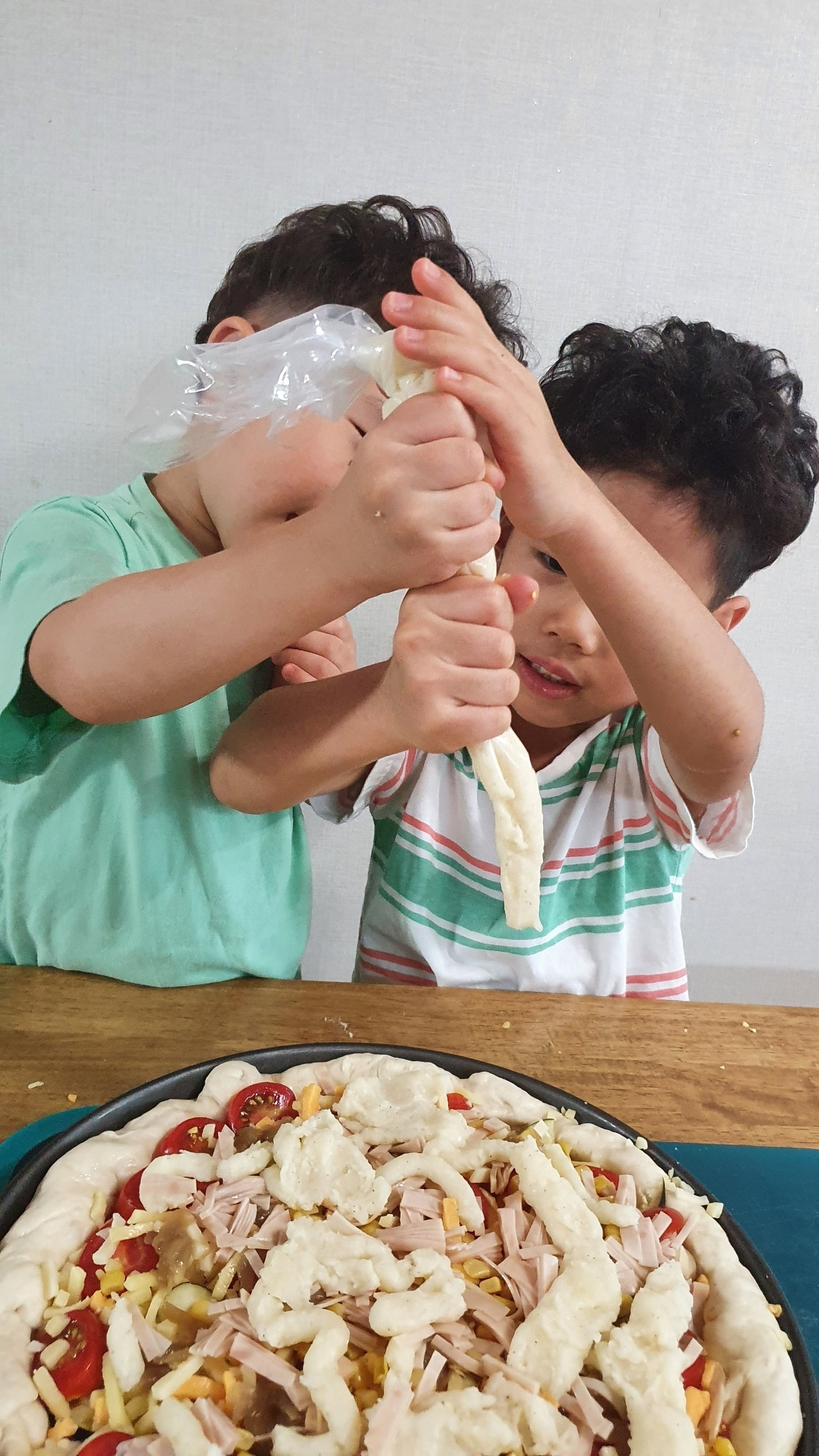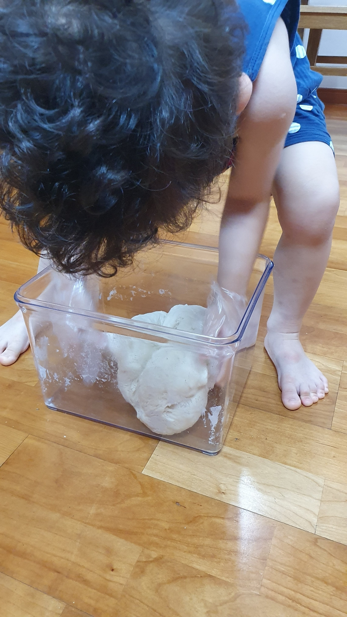 둘째가 저러다 계량 해 둔 물을 쏟아서 어쩔 수 없이 또 감으로 알아서 반죽했다. 서로 하겠다 난리인 뽀글머리 둘.