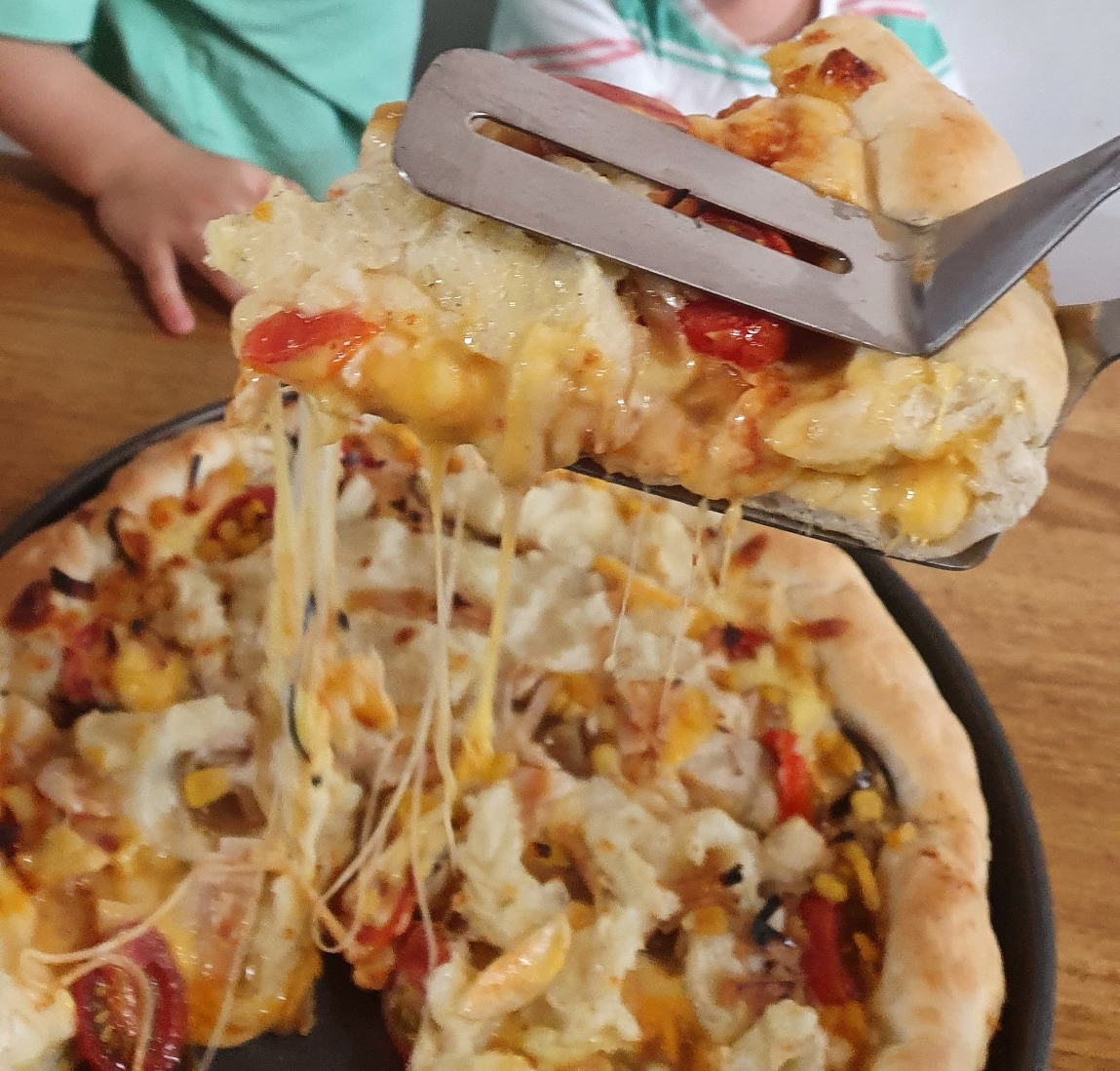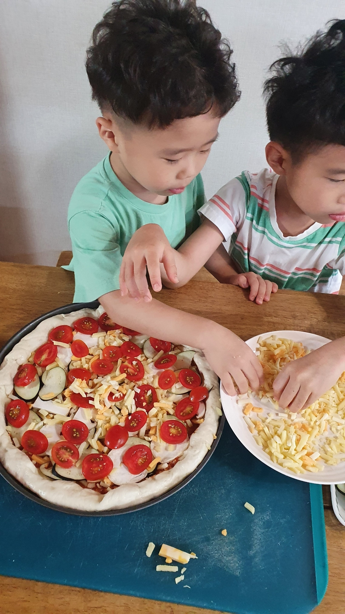 어린 나의 병후 회복식이었던 홈메이드 피자는 애들 말마따나 거다이맥스 메가 진화를 하여 지금은 아이들과 함께 만드는 즐거운 쿠킹 시간이 되었다. 밀가루 반죽이 커지는 것, 치즈가 줄줄 녹아 흐르게 된 것, 가지와 버섯도 맛있게 먹는 경험을 했다. 야채를 골라내지 않는다. 이쁘다.