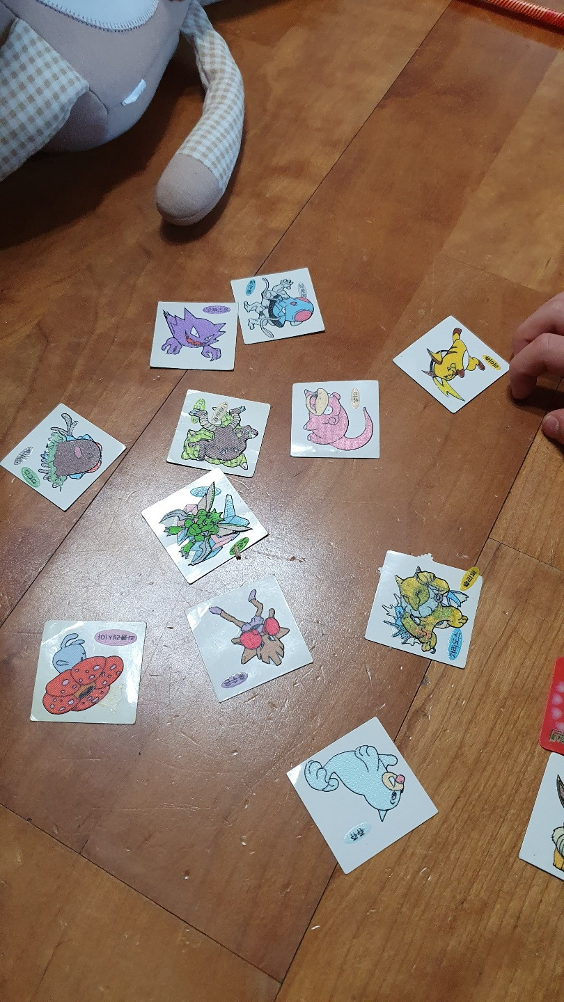 포켓몬 빵이 부활했다. 내가 중학교 다닐 즈음 포켓몬 빵이 대 유행을 했는데, 나는 빵에도 별로 관심이 없고, 포켓몬 캐릭터에도, 띠부실이라고 하는 그 스티커에도 관심이 없었다. 빵이 먹고 싶으면 다른 빵도 많았고, 포켓몬 중에는 아는 애들이 없었고, 스티커를 모으는 아기자기함은 나와는 거리가 멀었다. 그러다가 올해 포켓몬 빵이 다시 나왔다. 나는 거기에 얽힌 추억이 없으니 큰 감흥이 없는데 이번에 나오는 포켓몬 빵은 그 시절을 추억하는 우리 어른들과 지금 아이들이 함께 열광하는, 빵 이상의 존재인가보다. 포켓몬빵을 도통 구하기가 힘드니 애들 아빠가 비장의 무기를 오픈했다. 호랑이 담배피던 시절, 자기가 중학생일 때 모아 둔 띠부 띠부실을 공개한 것. 엄청난 보물을 보여 주 듯 으쓱대며 아이들에게 하나씩 선물해 주고는, 뒤돌아서 어찌나 아까워하던지. 여하튼 우리 아이들은 무려 90년대에 태어난 묵고 묵은 띠부실을 구경하고, 선물로 받았다.