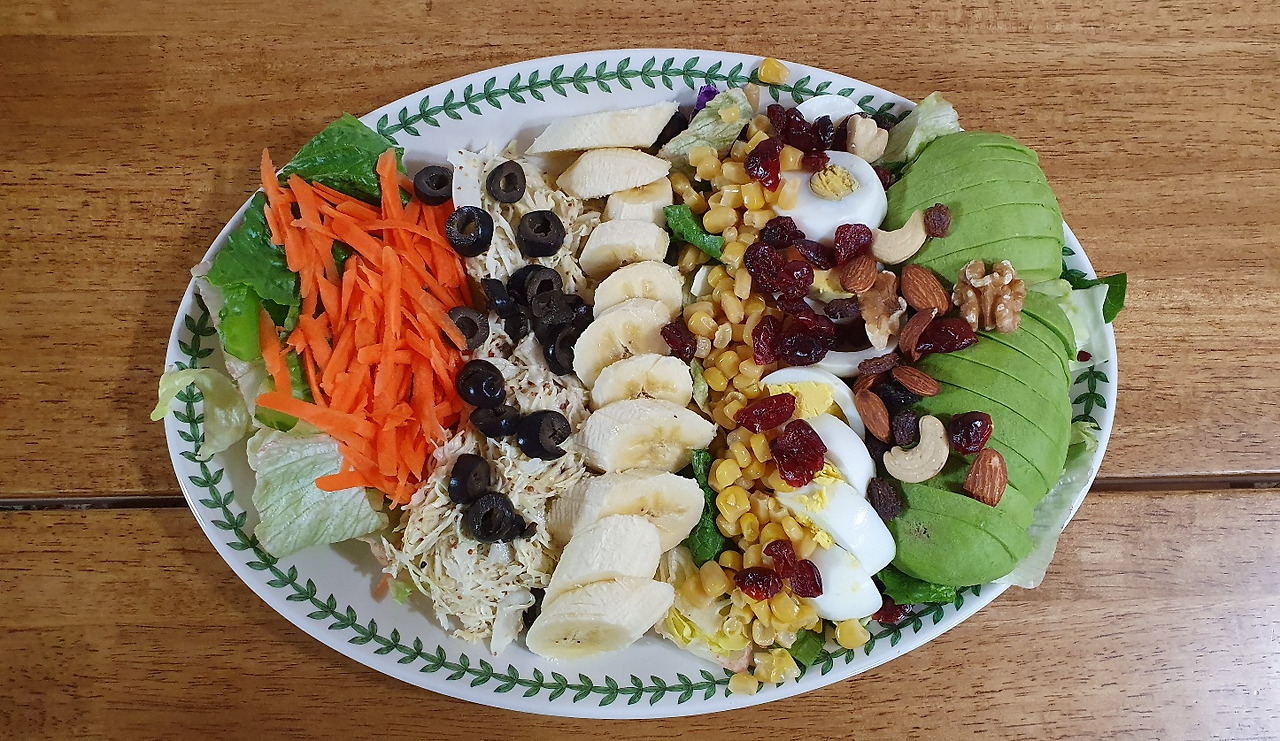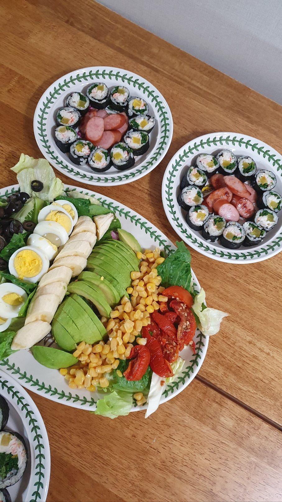 이렇게 줄줄이 재료들을 쪼르르 늘어놓는 메뉴를 콥샐러드라고 해서 특별한 이유가 있는 줄 알았는데, 콥이라는 이름을 가진 요리사가 냉장고에 있는 재료들로 접시를 꾸며 샐러드를 만들기 시작했다고 해서 콥 샐러드라고 한다. 한마디로 서양식 냉털 샐러드 요리라고나 할까. 재료는 그때그때 있는 재료를 쓰면 된다. 드레싱도 요거트와 허브, 마요네즈 베이스의 렌치소스가 인기 있지만 각자의 취향에 맞게 고르면 된다. 샐러드용 채소들을 구비한 김에 옥수수 통조림도 사고 계란도 여러 개 삶아 놓았다. 언제든 접시에 담기만 하면 되도록.