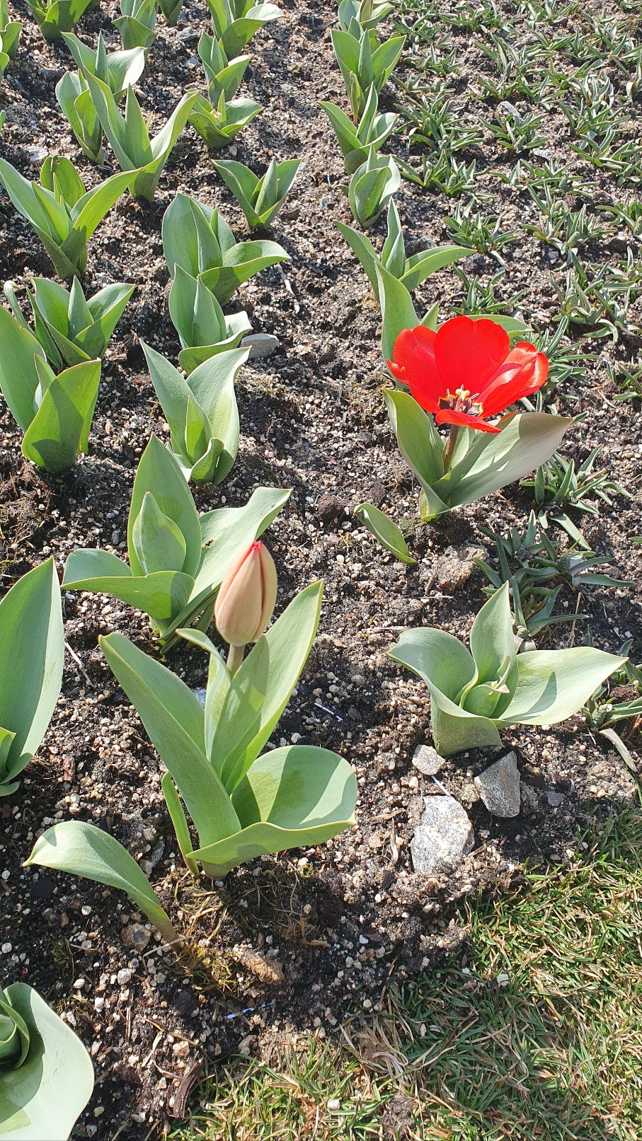 곧 벚꽃이 절정을 이루는 시기를 대략적으로 알려주는 기사가 나올 것이다. 하얀 벚나무 아래서 손을 잡고 거닐며 구경하는 꽃나무의 모습도 물론 아름답다. 하지만 아롱이다롱이 각자 다른 속도로 세상과 마주하고 있는 초봄의 꽃밭을 보는 감동이 나에게는 더 크다. 묵묵히 저마다의 속도로 자라는 모습, 먼저 피었다고 뽐내지 않는 모습, 거기에 오늘은 쓰러진 튤립 한 구근을 손으로 일으켜 세워주던 어느 집 딸내미의 예쁜 손까지 보았으니 2023년의 튤립 꽃밭도 아름다운 기억으로 남을 것이다.