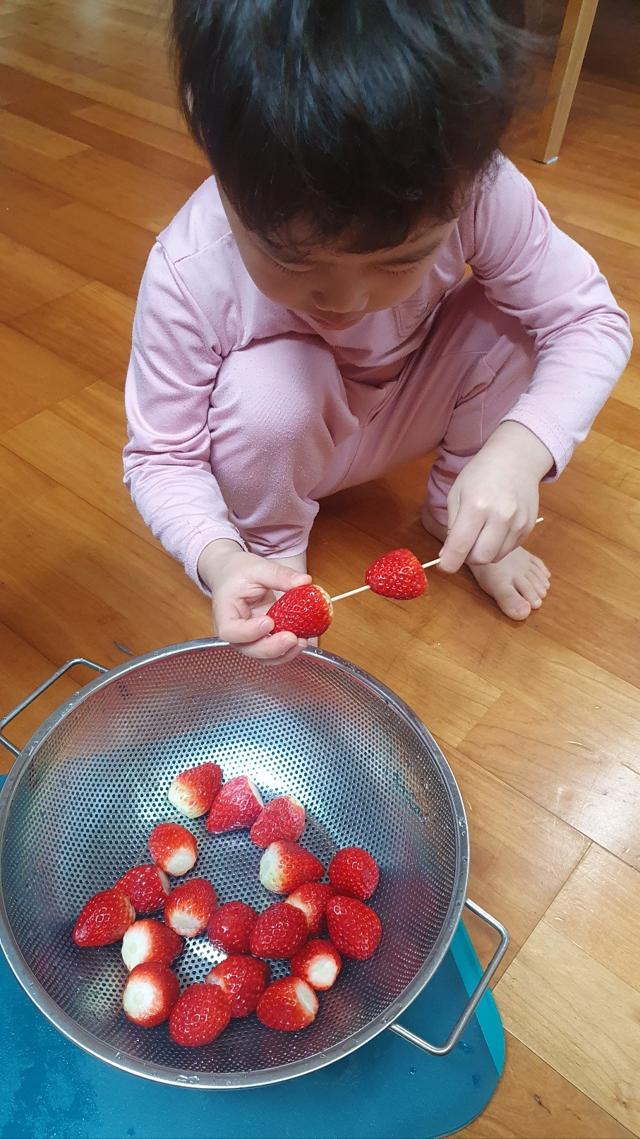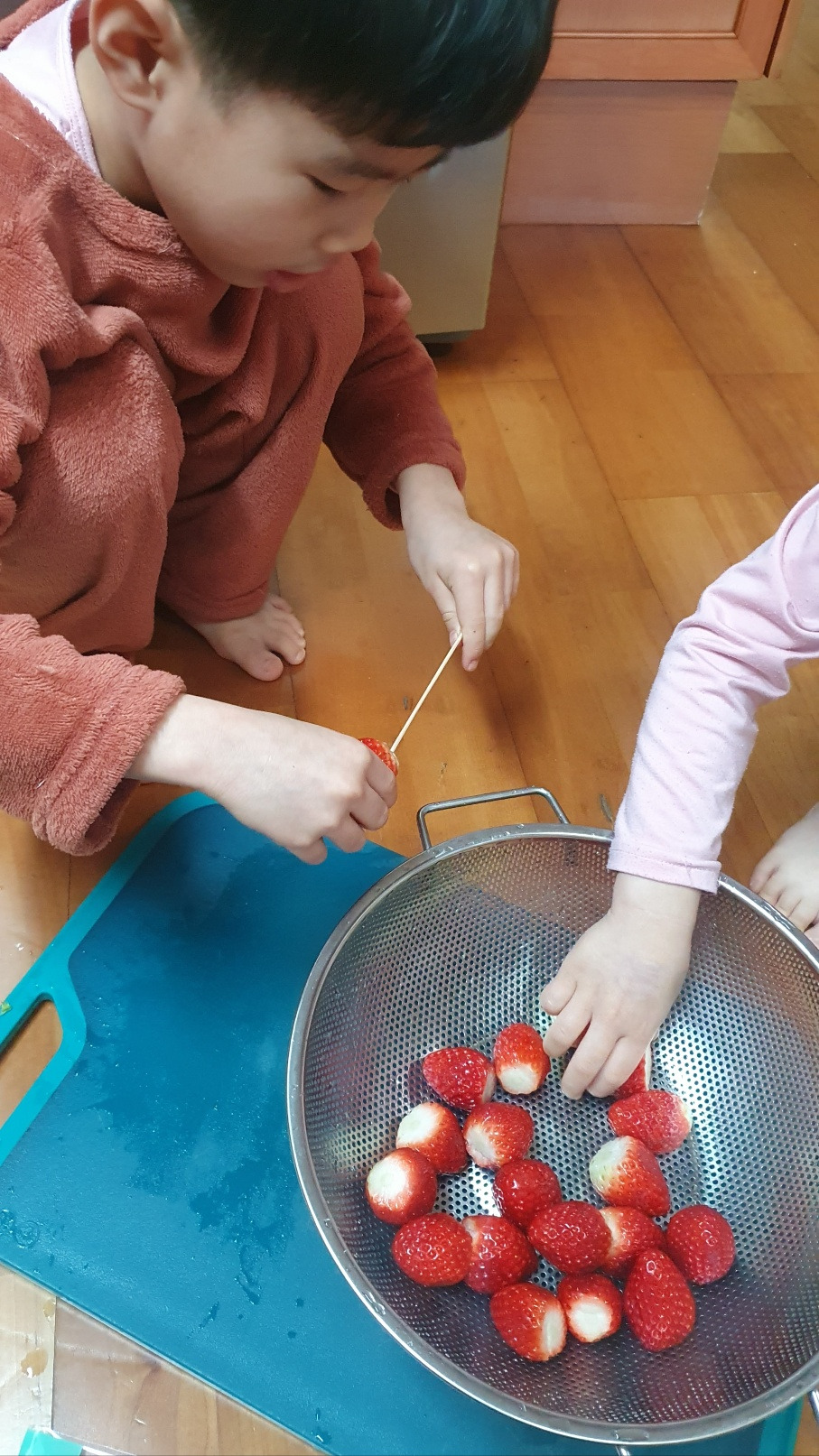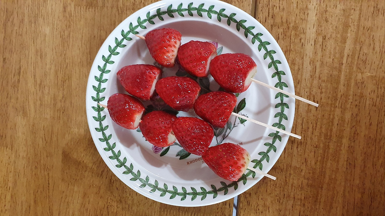 아이들과 탕후루를 만들었다. 아이들은 딸기를 꼬치에 꽂기만 했고 내가 설탕 시럽을 만들어 발라서 얼렸다. 야시장이나 번화가, 놀이동산에 가면 탕후루 파는 곳을 종종 본다. 아이들이 좋아하는 딸기가 꼬치에 꽂혀 떡 하니 진열되어 있으니 언제나 단골로 사 달라 소리가 나오는 길거리 간식이다. 밖에서 사 먹는 탕후루는 비싸기도 비싸지만 아이들이 먹기가 쉽지가 않다. 일단 딱딱하게 얼은 채로 나오고 차갑게 굳었던 설탕 시럽이 입술과 얼굴에 닿으면 끈적끈적 지저분해지기 일쑤인데 더 이상 영유아의 보호자가 아니라 내 가방에는 물티슈가 없을 때가 많으니 밖에서 사 먹다가 뒤처리가 곤란했던 적이 여러 번이다. 마침 딸기가 마감 세일, 두팩에 오천 원 하길래 데려왔다. 한 팩을 씻으며 탕후루를 한 번 만들어 보기로 한다.