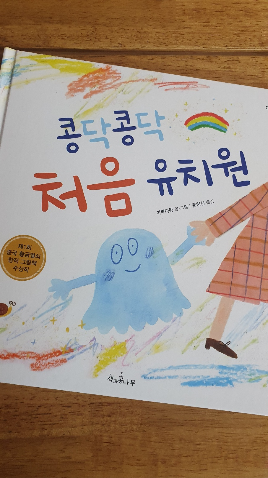 둘째와 함께 <콩닥콩닥 처음 유치원>이란 그림책을 읽었다. 유치원에 새로 온 친구는 요괴인데 눈에 보였다, 안 보였다 하는 우리와는 다른 친구이다. 친구들은 호기심에 다가가지만, 요괴 친구는 유치원이 너무 낯설다. 설상가상으로 손오공이 요괴를 잡으러 오니 모든 친구들이 함께 낮잠 이불을 뒤집어써 손오공이 누가 요괴인지 모르게 만들어 결국엔 손오공을 물리쳐준다. 그러자 비로소 마음을 열게 된 요괴 친구, 친구들과 함께 즐거운 하루를 보낸 후 여느 아이들과 마찬가지로 엄마에게 달려가 내일 또 유치원에 오겠다고, 너무 즐거웠다고 이야기하며 하루를 마친다. 요괴도 우리와 똑같이 엄마 앞에서는 어린아이이다. 모습이 조금 다르지만 다 같은 친구들이라는 걸 보여주며 겉모습이 달라도 친구라는 걸, 새로운 유치원에서는 누구나 긴장이 된 다는 메시지를 전한다. 손오공이 무서워 벌벌 떠는 요괴 친구를 위해 모두 한 마음으로 낮잠 이불을 뒤집어쓰는 장면이 너무 예뻤다. 아이들은 이렇게 선하다.
