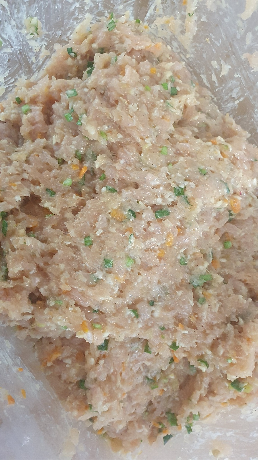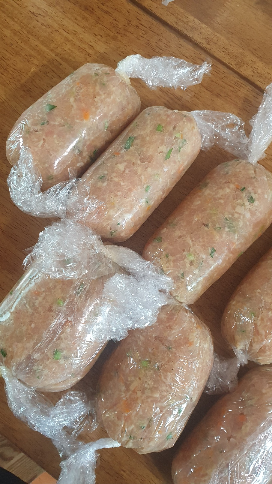 인터넷으로 닭 다짐육을 찾았다. 이유식용 냉동 소량은 잘 나오는데 대량으로 생고기 다짐육은 한참만에 찾을 수 있었다. 그냥 튀겨도 부드러운 닭 안심을 다짐육으로 준비하고 나머지 준비는 마음의 준비만 하면 된다. 닭 다짐육에 다진 마늘을 비롯해 냉장고에 있는 채소들을 다져서 버터에 한번 볶아 한 김 식혀 두었다. 닭 다짐육과 섞어서 소금 간을 하고 찹쌀가루와 빵가루, 계란을 넣어 치대니 반죽이 된다. 동그랑땡 반죽이나, 함박 스테이크 반죽이나, 떡갈비 반죽이나 비슷 하지만 닭 다짐육은 가장 큰 특징이 있었는데 그것은 바로 무척 질다는 것. 고기 자체에 수분이 많은 건지 어쩐 건지 돼지고기나 소고기 반죽을 할 때와 비슷한 양의 가루류를 넣어 반죽을 해도 질척한 느낌이 있었다. 이래서 시판 치킨 너겟에는 닭고기 함량이 그렇게 적은가 보다 싶기도 했다. 고기 함량 60퍼센트 이상인 것을 찾기 힘든 것 같았다. (애정하던 공룡 너겟도 56퍼센트 밖에 되지 않는다) 도저히 밀, 계, 빵가루로 튀김옷을 입혀 튀길 자신이 없어 랩에 김밥처럼 말아서 소분하였다. 인터넷을 찾아보니 이대로 삶아서 소시지처럼 만든 후에 밀, 계, 빵을 입혀 튀기기도 한다던데 그러자니 랩에서 환경호르몬이 너무 나올 것 같아 그냥 얼려서 보관하기로 하였다. 얼린 후에 썰어서 모양을 잡아 기름 둘러 굽기도 하고, 짤 주머니에 넣어서 한입 크기로 구워서 카레에 넣기도 하고, 피자에 재료로 사용하기도 했다. 일단 만들어 두면 휘뚜루마뚜루 사용 되는 것이 또 치킨 너겟 반죽의 장점인가 보다.