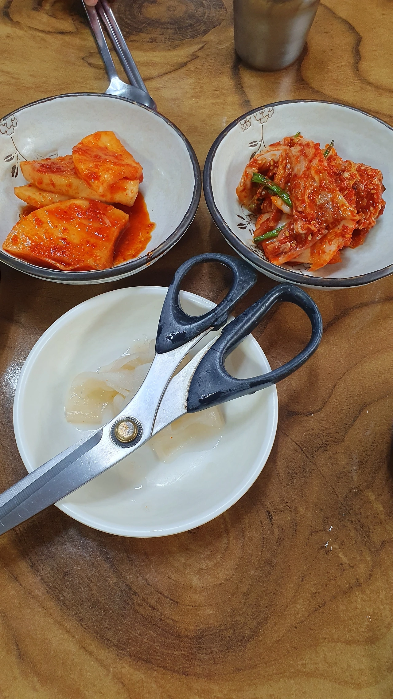 점심은 차를 타고 국제시장 쪽으로 넘어가는 동네에 있는 한 밀면집에서 먹었다. 동네 맛집인지 주말 점심이라 그런지 사람이 가득하다. 밀면을 처음 먹어봤는데 냉면 쫄면보다 부드럽고 국수보다는 고급진 느낌이라 너무 맛있게 먹었다. 나는 로컬 식당의 기준을 할아버지들로 잡는 편이다. 할아버지들이 친구분들과 와서 드시고 계시다면 진짜 맛있는 집! 이 집이 그랬다. 바로 옆 테이블에서 식사하시던 할아버지 네 분이 우리 집 똑같은 옷을 입은 뽀글 머리 형제를 신기하게 보시다가 물으신다.