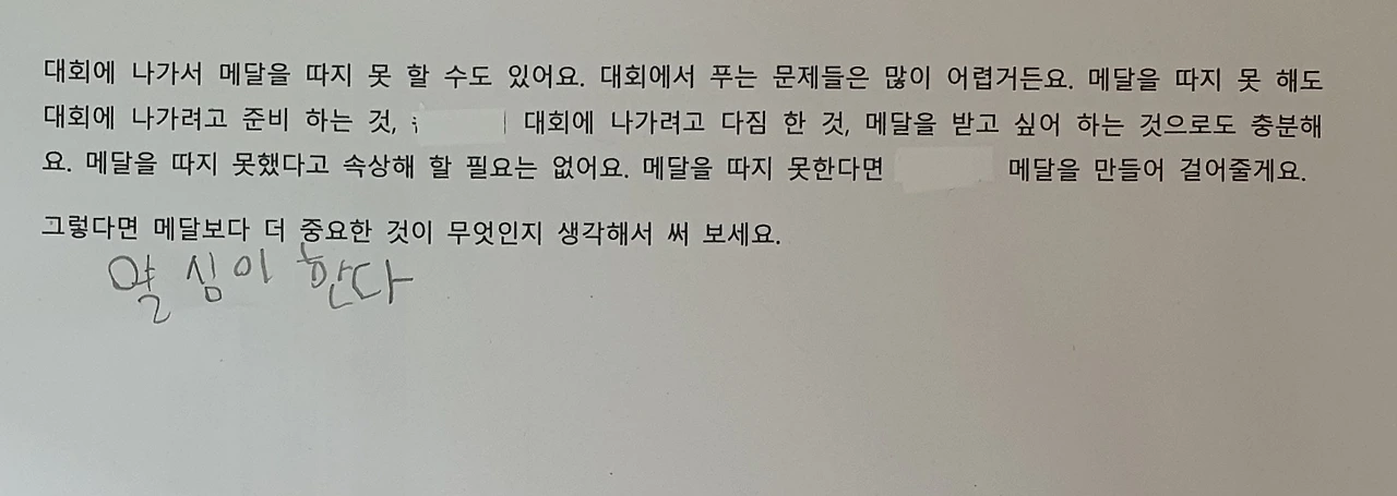 왜 잘하고 싶냐는 질문에 대한 답이 조금 묘했다. 그냥 못 하는 것이 싫기도 하고, 엄마한테 칭찬받는 것이 좋다고도 한다. 전자는 괜찮은데 후자가 조금 걸렸다. 내가 잘할 때만 칭찬을 해 주었나, 열심히 하는 과정을 칭찬해 주는 엄마이고 싶었는데 나도 모르게 결과물에 칭찬이 얹어졌나 보다. 그래서 솔직하게 이야기했다. 잘했다고 칭찬한 건 엄마가 잘 못 한 것 같다고, 열심히 했으면 못 해도 칭찬받는 것이 맞으니 앞으로 또 그런 일이 있으면 엄마한테 이야기하라고 했다.