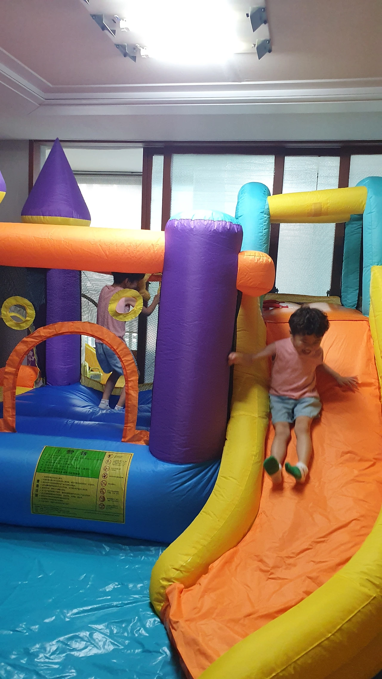 아이들과 어린이 도서관에 잠깐 갔다가 외식을 하고, (어린이 도서관은 핑계고 외식을 하러 나갔다) 들어와서는 오랜만에 에어바운스를 꺼내어 주었다. 거실 소파를 이리저리 옮겨야 하는 번거로움과 수고가 들지만, 그래도 한두 시간은 키즈카페에 나에 나간 것처럼 땀을 빼며 놀 수 있어 한여름과 한겨울에 유용하게 쓰는 효자템이다.