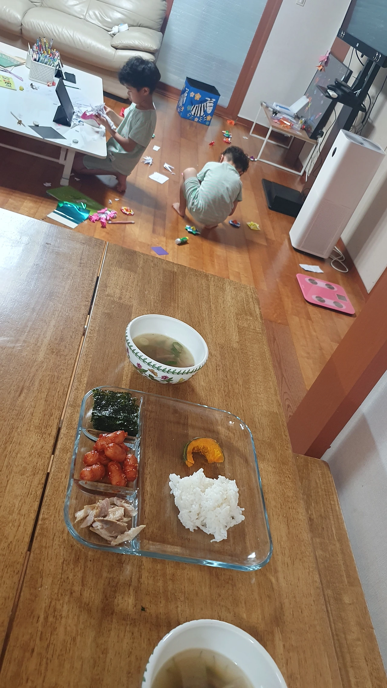 우리 집도 그냥 밥을 먹는다. 이번 끼니도 밥, 뼈 없는 냉동 갈비탕, 생선구이, 소시지 볶음에 김구이를 얹었고 단호박 한 조각을 추가했다. 이 정도면 차려먹은 편에 속해서 사진을 남긴다. 아이들도 엄마 밥 보다는 아빠가 한 가득 사온 간식에 더 열광하고, 신랑도 라면이 먹고 싶은 날이라며 안성탕면을 끓인다. 밥 차려 놓고 열 번은 불러야 밥상에 앉는 아이들, 밥 보다 놀이가 더 좋은 아이들이다. 애들은 입이 조금 짧은 편, 그나마 집에서 만들어 떠 먹이는 밥을 잘 먹는다. 아이들이 어릴 때엔 큰 아이 삼시 세끼에 둘째 이유식까지 부엌에서 살았지만 이젠 부엌일의 총량이 다 된 듯, 만사 귀찮기만 하다. 날씨가 더운 여름이라 더 한 것 같다. 아이들이 가끔은 분식집에서 한 끼, 편의점에서 삼각김밥에 컵라면으로 끼니를 때울 수 있을 만큼 자라니 예전처럼 정성을 들여 매 끼 해 먹일 필요가 없어졌는데, 의무의 강도와 칼질의 빈도가 낮아진 밥 하기는 서서히 브레이크를 밟아 속도가 낮아지는 자동차처럼 더, 더, 더, 귀찮기만 하다.