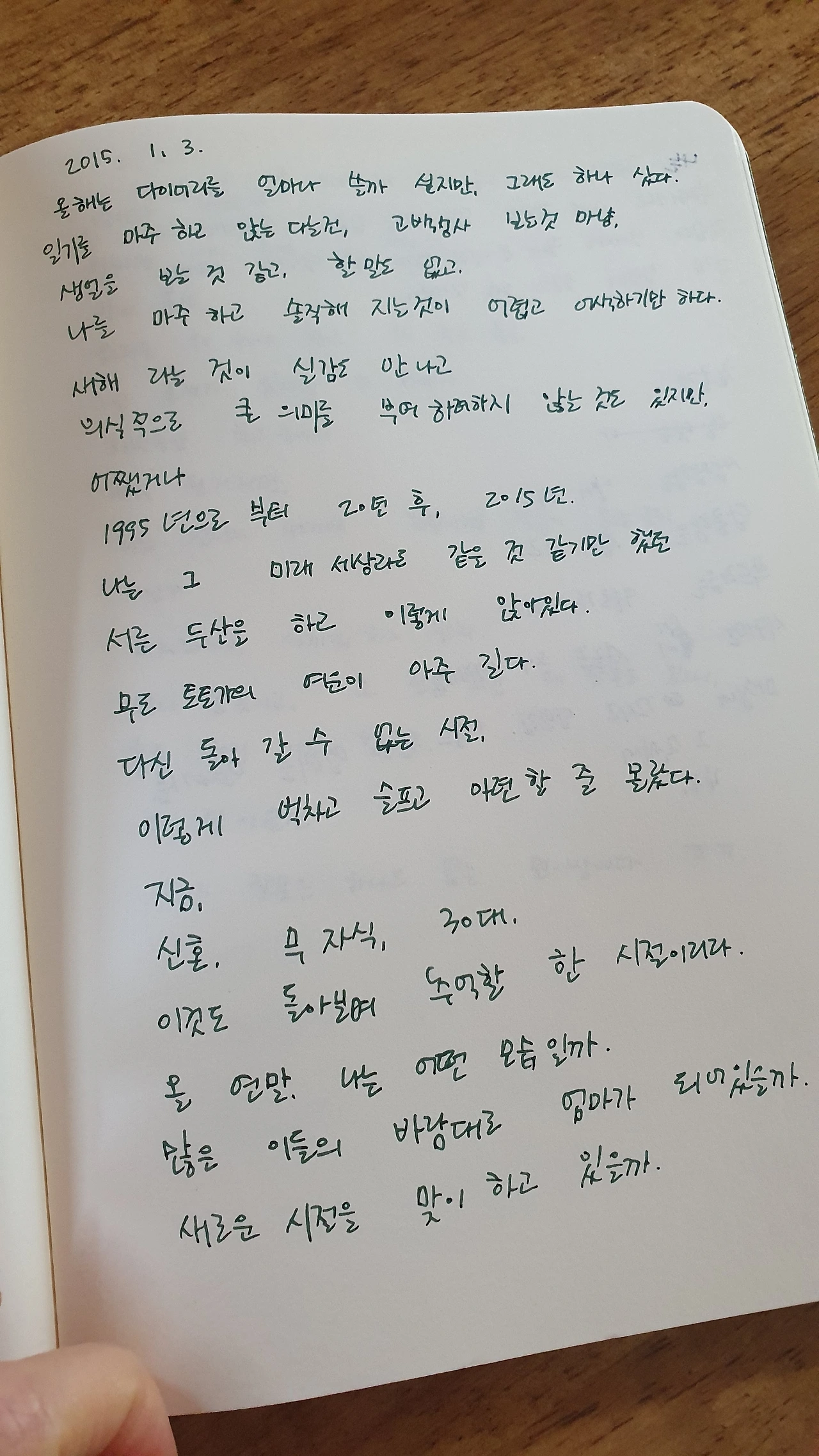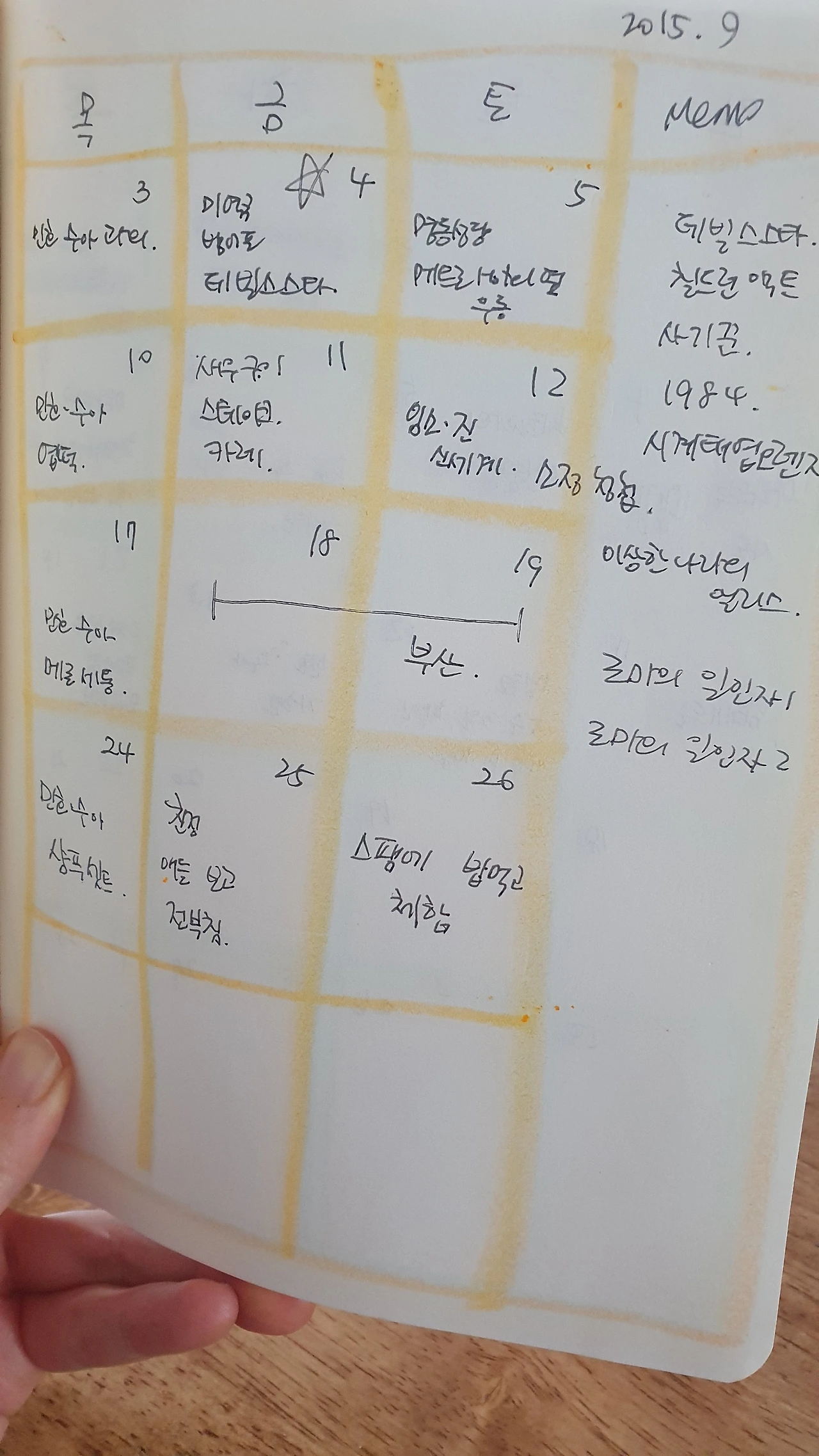 그러다가 오늘 작은 노트를 한 권 발견했다. 2015년 다이어리 대신 쓰던 작은 노트이다. 한동안 겉이 가죽으로 된 비싼 다이어리를 선호했던 시절이 지나고 비로소 소박해진 노트, 그래서 책장에 끼워져 있어 그때 다이어리 버리던 날 용케 내 눈에 띄지 않았던 작은 노트이다. 2015년 1월부터 10월까지의 행적이 비교적 자세히 적혀있다. 잊고 있던 기억도 스케줄에 적힌 내용을 보니 어렴풋이 기억이 나기도 한다. 영화 샌안드레아스를 보고 지구 종말에 대해 고민한 흔적도 보인다. 그리고 그 소소한 기록은 2015년 10월 첫째를 임신하고 지옥 같은 입덧이 시작되는 무렵 끝이 나 버렸다.