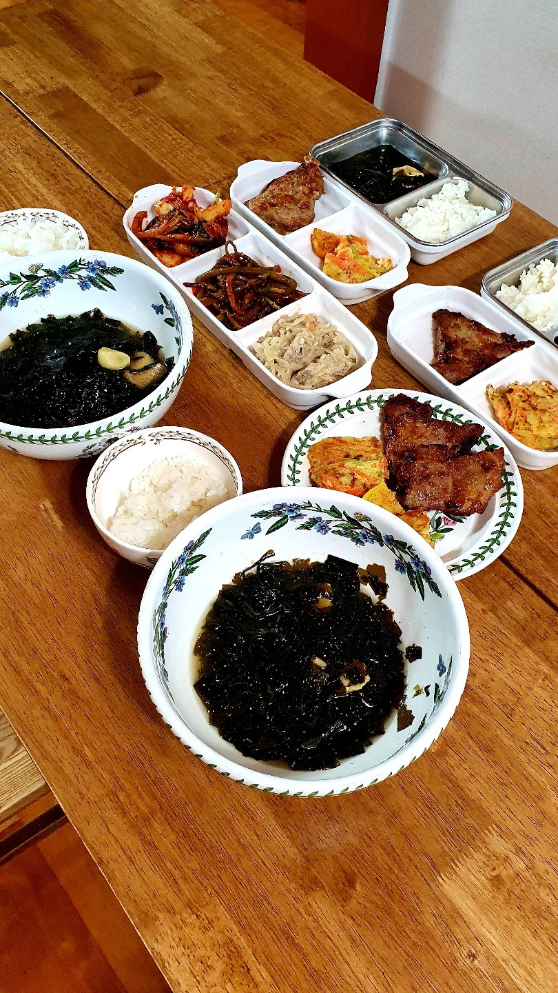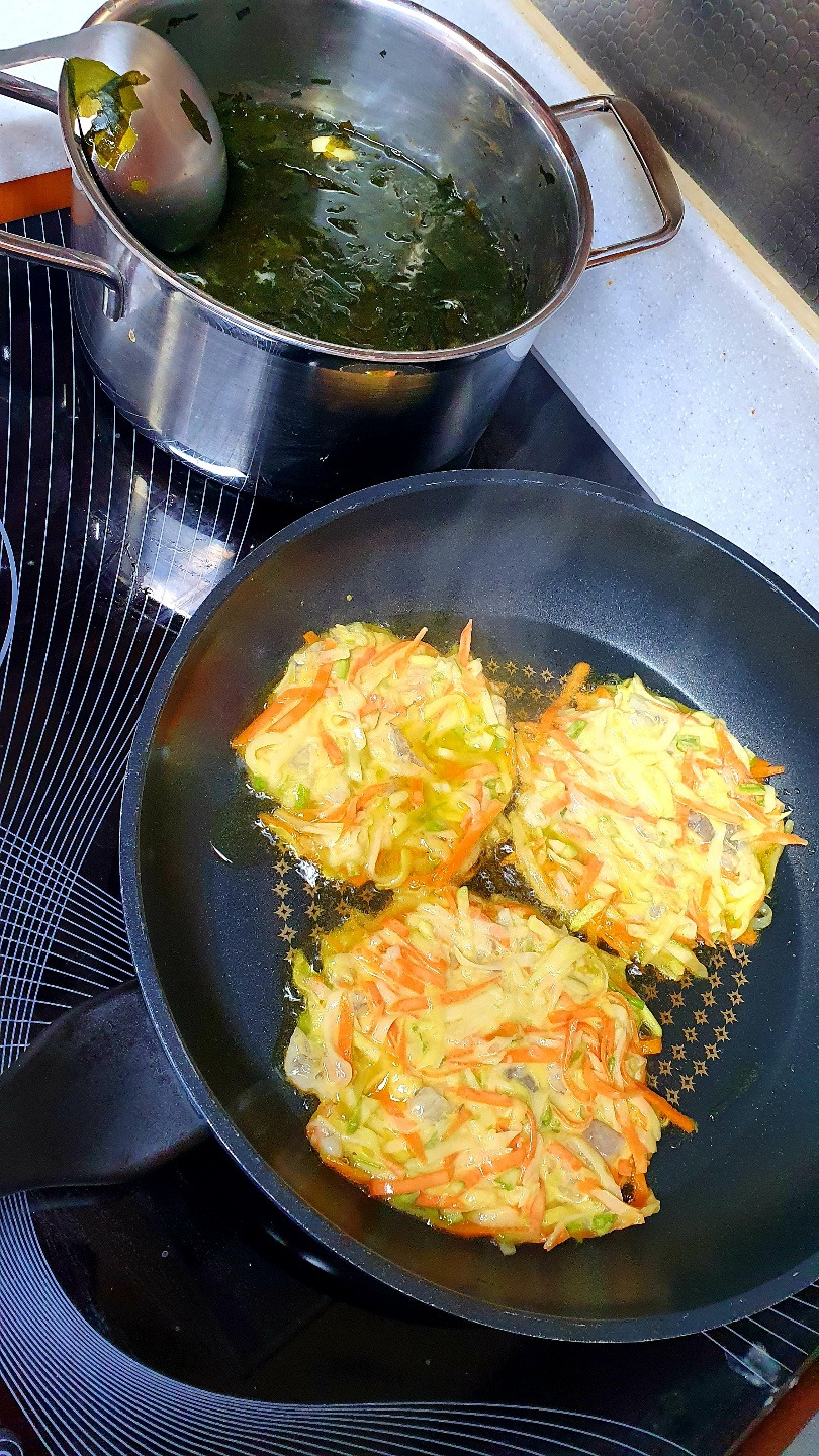 쪼그라지는 애호박, 시든 당근, 한 쪽 남은 양파, 감자 두 알이 눈에 띄어 채를 썰어 모둠 채소전을 부치기로 하였다. 냉동실에서 새우도 꺼내 다져서 반죽에 넣고 계란도 한 알, 부침가루도 크게 두 숟갈, 물도 조금 추가하여 팍팍 젓는다. 잘 섞여야 뒤집을 때 찢어지지 않는다. 새우를 꺼내다가 발견한 순살 가자미로 미역국도 끓인다. 아줌마 8년차가 되니 미역국의 양을 조금 조절 할 수 있게 되었다. 예전에는 끓였다 하면 한 들통이었는데 이제는 네식구 한번 먹고 한번만 더 먹을 수 있는 양으로 끓인다. 장족의 발전.