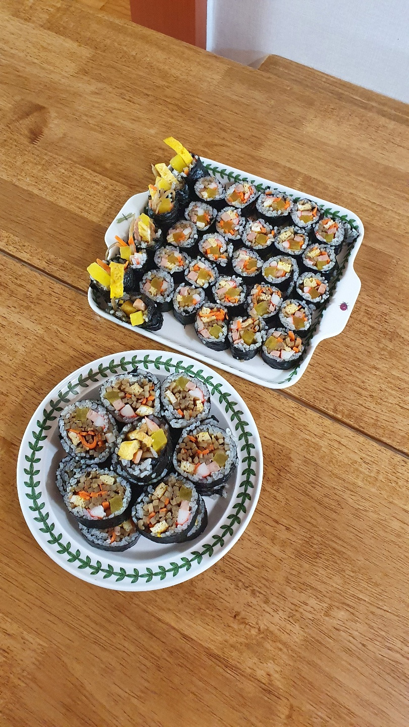 오늘의 김밥. 저 김밥을 네 식구가 다 먹었는데 나에겐 너무 과식이었다. 먹은지 여섯시간 지났는데 아직도 위장에 정체되어 있는 느낌.